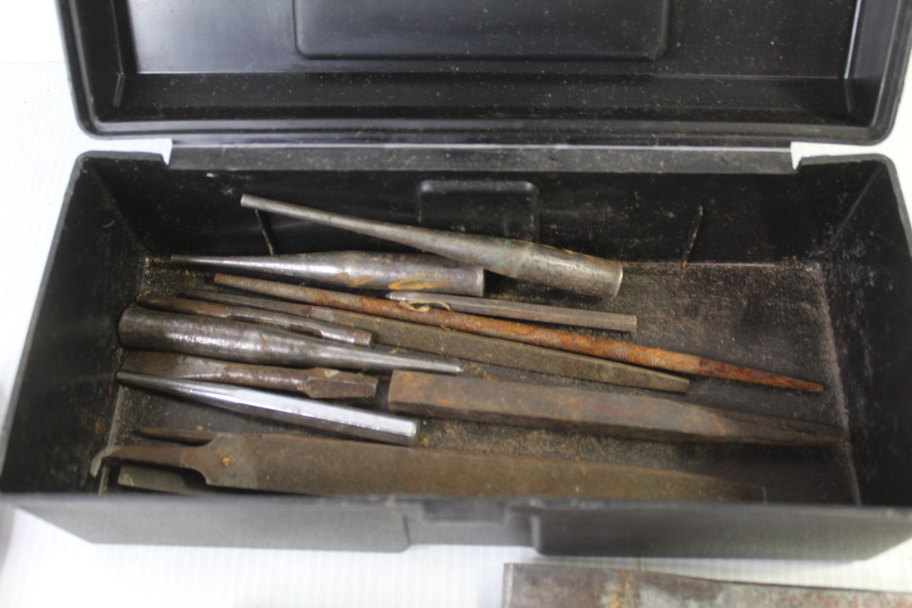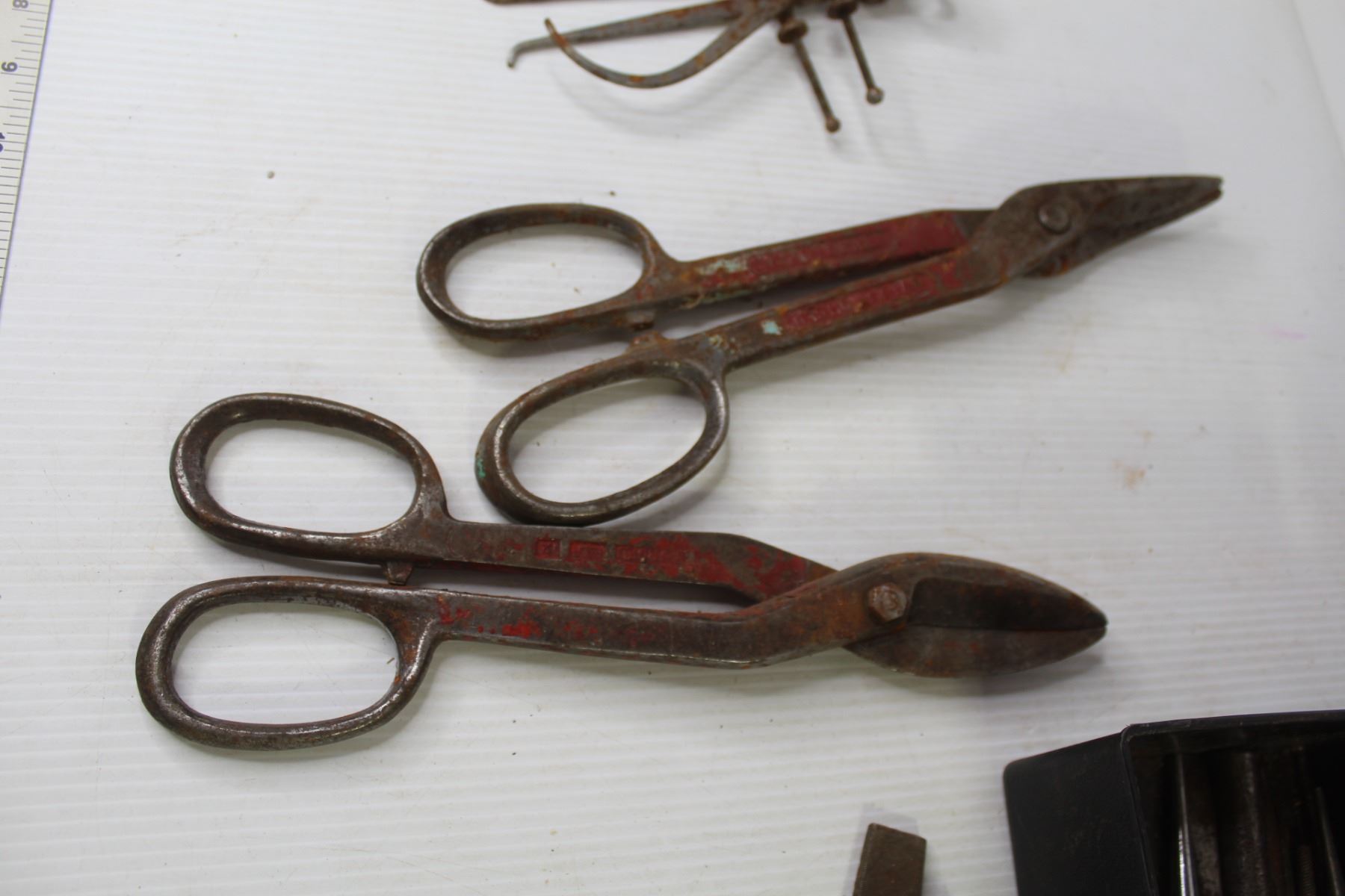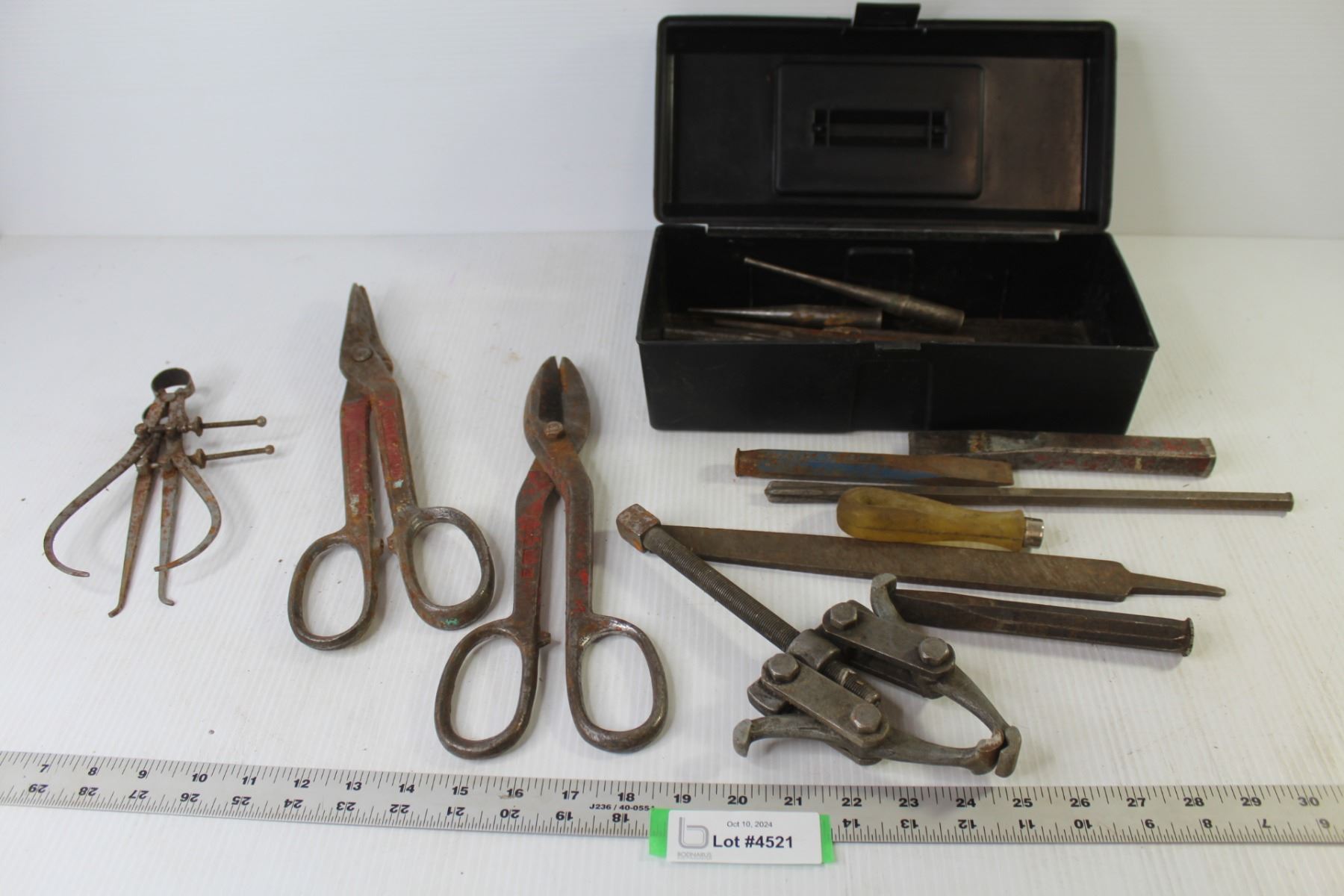 Sm Tool Box w/ Files & Cold Chisels - (2) Tin Snips - Gear Puller - 100' Measuring Tape - Misc. Items