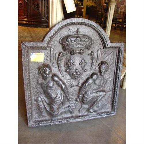 This antique French fireback depicts a Royal French Coat of Arms with figures of men supporting a shield with three fleur-de-lis. The background shows flags flying to either side, while there is an egg and dart motif surrounding the interior central dome shape of the fireback.