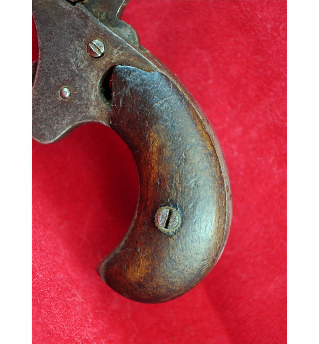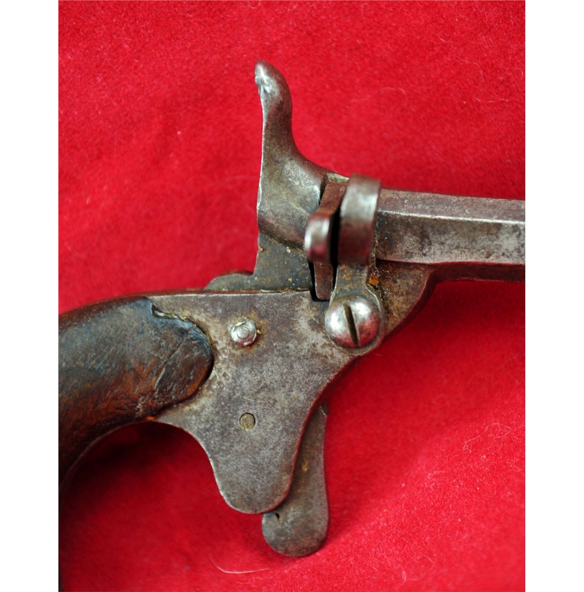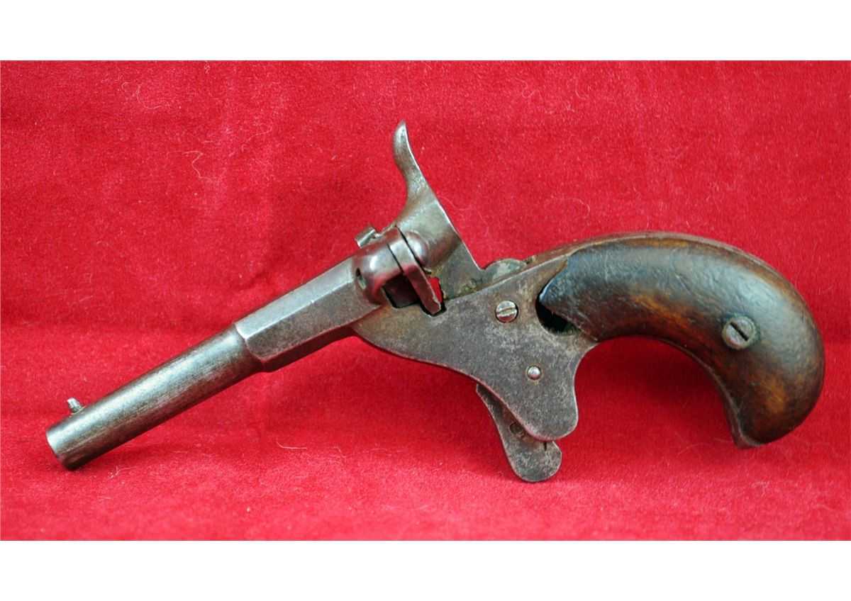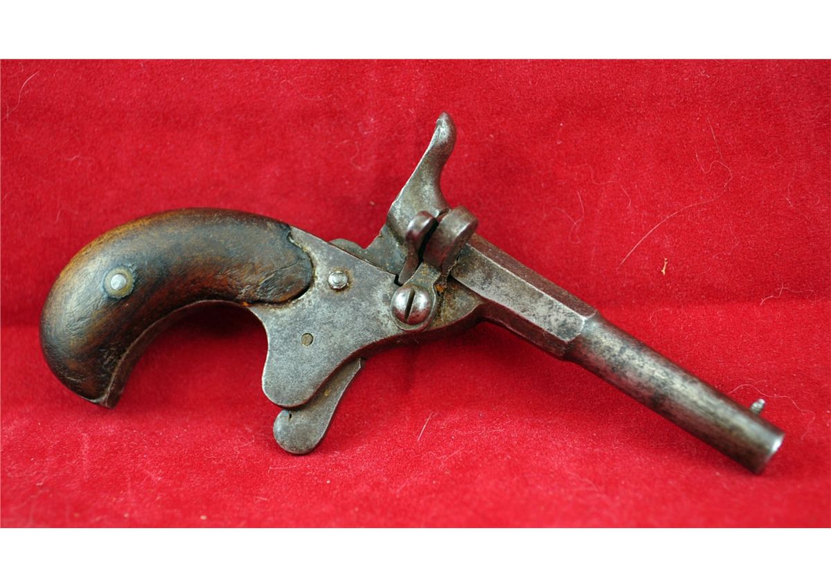 Small 22 Cal. Single Shot, Mid 19th Century Pistol with 2.3" Bbl.,Damage to Left Grip. Ser# 15575. Barrel must be removed to load. Do not attempt to fire this gun.Pistol has wear and damage to left grip, see photos for more information. Gun is being sold for decorative and collecting purposes NOT for firing. See photos for more information. Kennedys Auction Service has not attempted to test fire any gun in this auction and all guns are sold "IN AS IS CONDITION" and are not guaranteed to be operational.