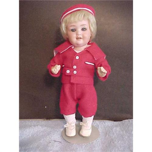 This 9" bisque head character doll is marked A.M. 560A Germany DRMR. The head is wonderful with no damage or repairs. He has blue sleep eyes and an open mouth with teeth. He has good painting. There is a faint check rub that doesn't even show in the pictures. The composition body appears to have been repainted in places--not a bad job. The wig may be replaced--mohair hair I think and too long for a boy but new owner can cut and arrange it. Clothing is replaced and very appropriate for the doll. This is a rather rare doll and so cute. Boy dolls properly dressed are hard to find. p.s. the white mark in last pix near his mouth is a reflection and not really there in person.