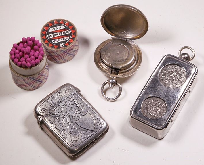 Great Britain, engraved sterling silver Vesta case, Birmingham, 1899 with Bryant & May, Wax Vestas matches; together with EPNS rectangle Sovereign and Half Sovereign case and single base metal Sovereign case (4 items)