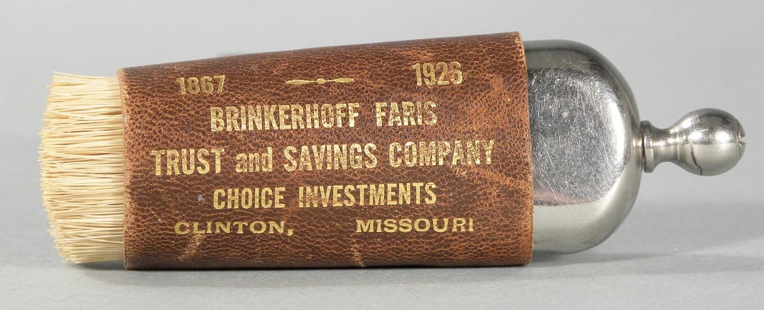 Small Advertising Whisk Broom with leather sleeve for Brinkerhoff Faris Trust and Savings Company. Clinton, MO. Excellent condition. 3 1/2 inches long. Start Price $20