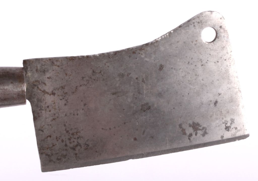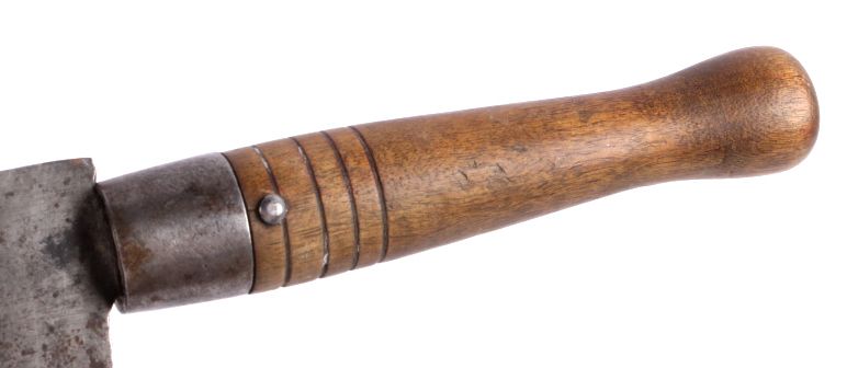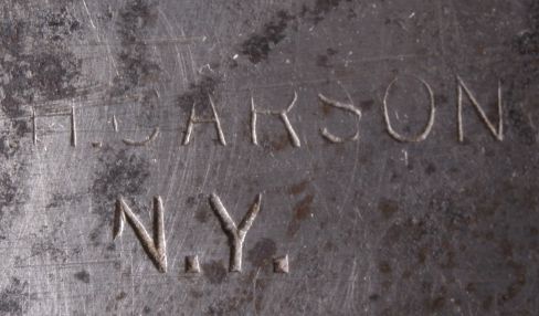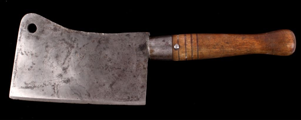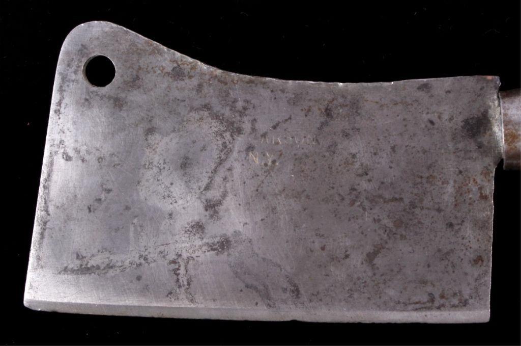 This lot features a small antique meat cleaver. This unique cleaver is marked "H. Carson N.Y.". It has a wooden handle and measures 11.5" with a 5.5" blade.