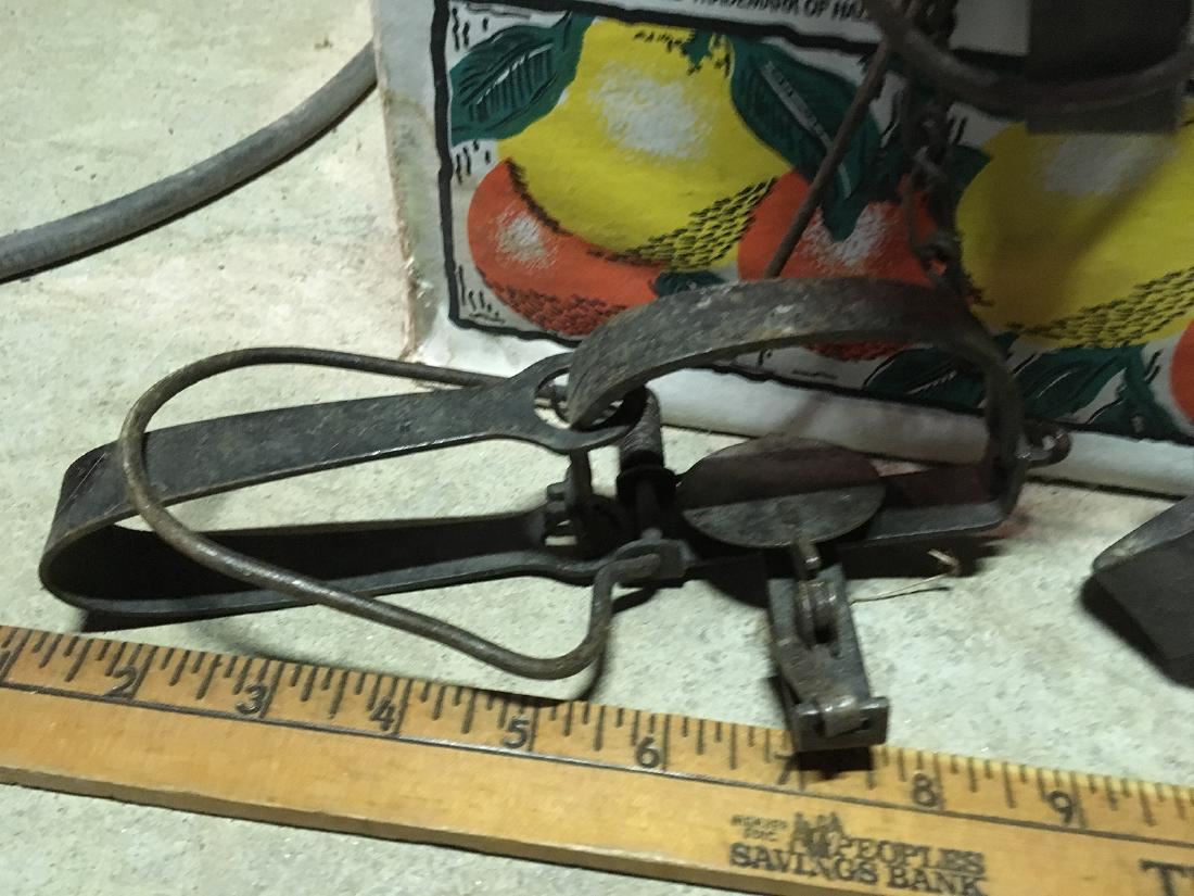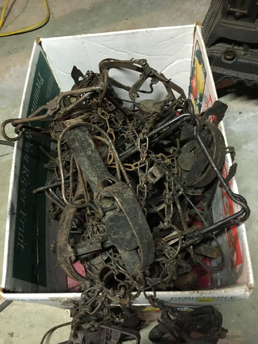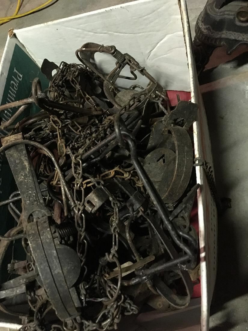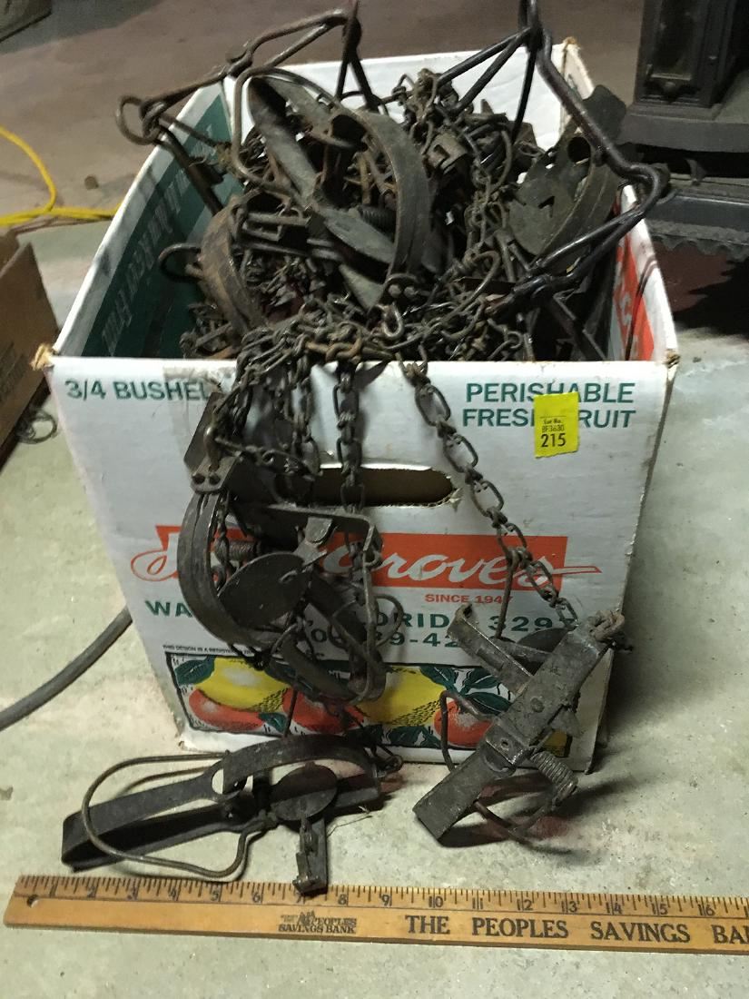 Small antique steel traps, approx. 30 small traps in box. Being sold as found from a lifetime collection. (RL)
