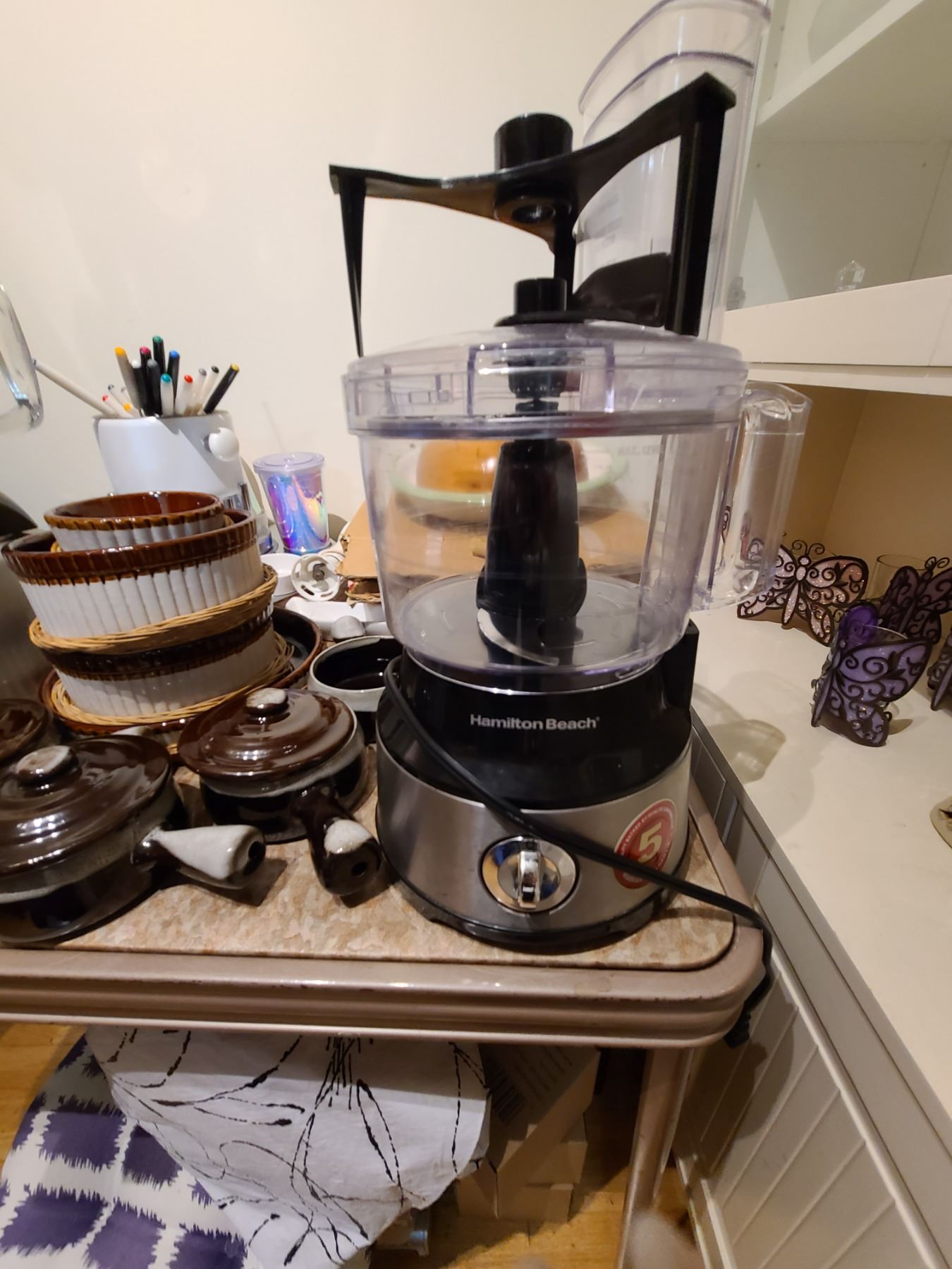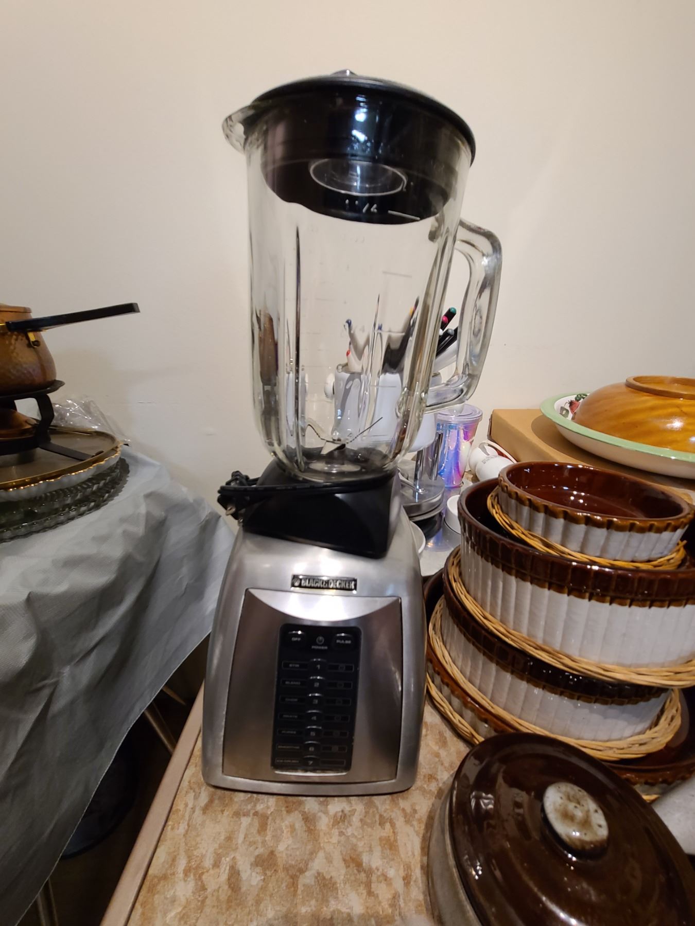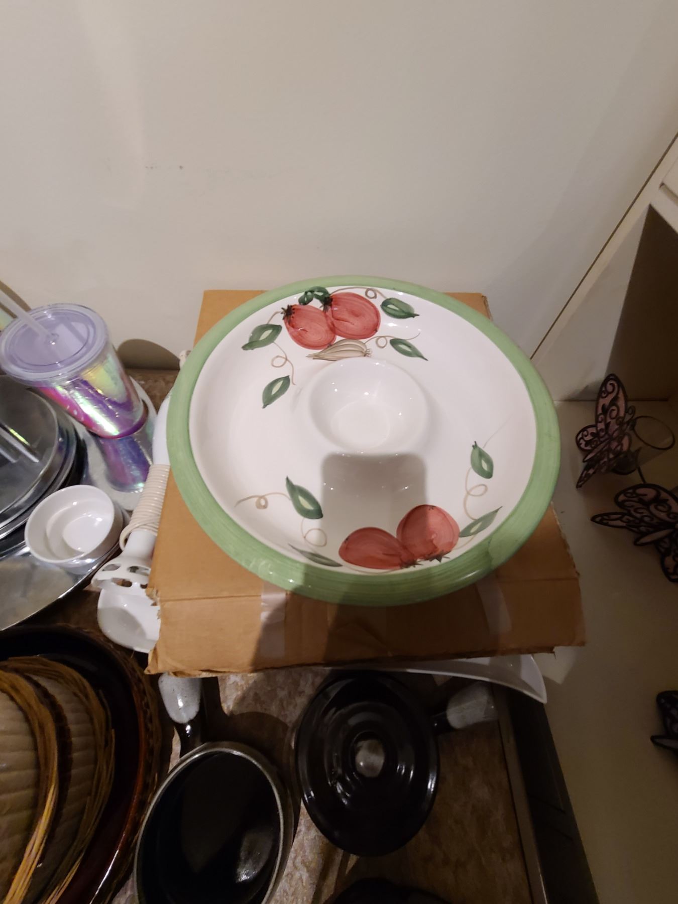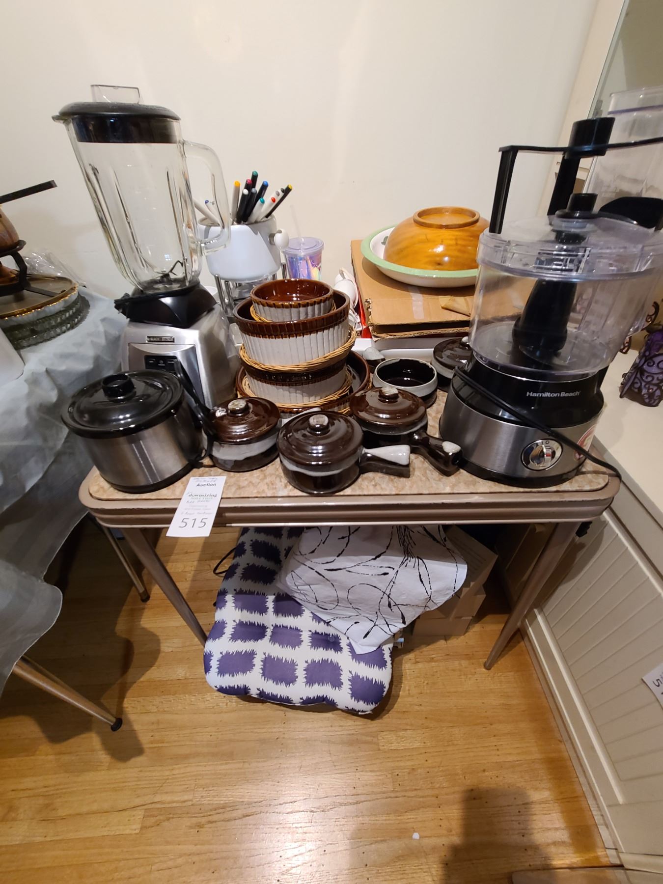 Appliances include Gourmet Village dip warmer, Hamilton Beach processor, B&D blender, ceramic pottery, serving platters, fondue set, and more. Bring boxes. Pickup in cat. B at 10 am.