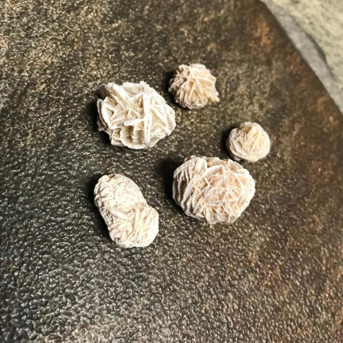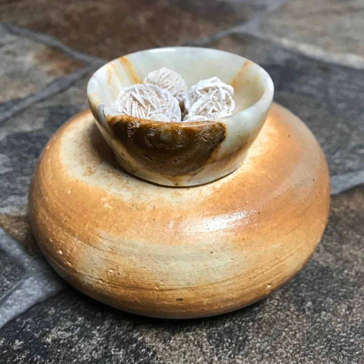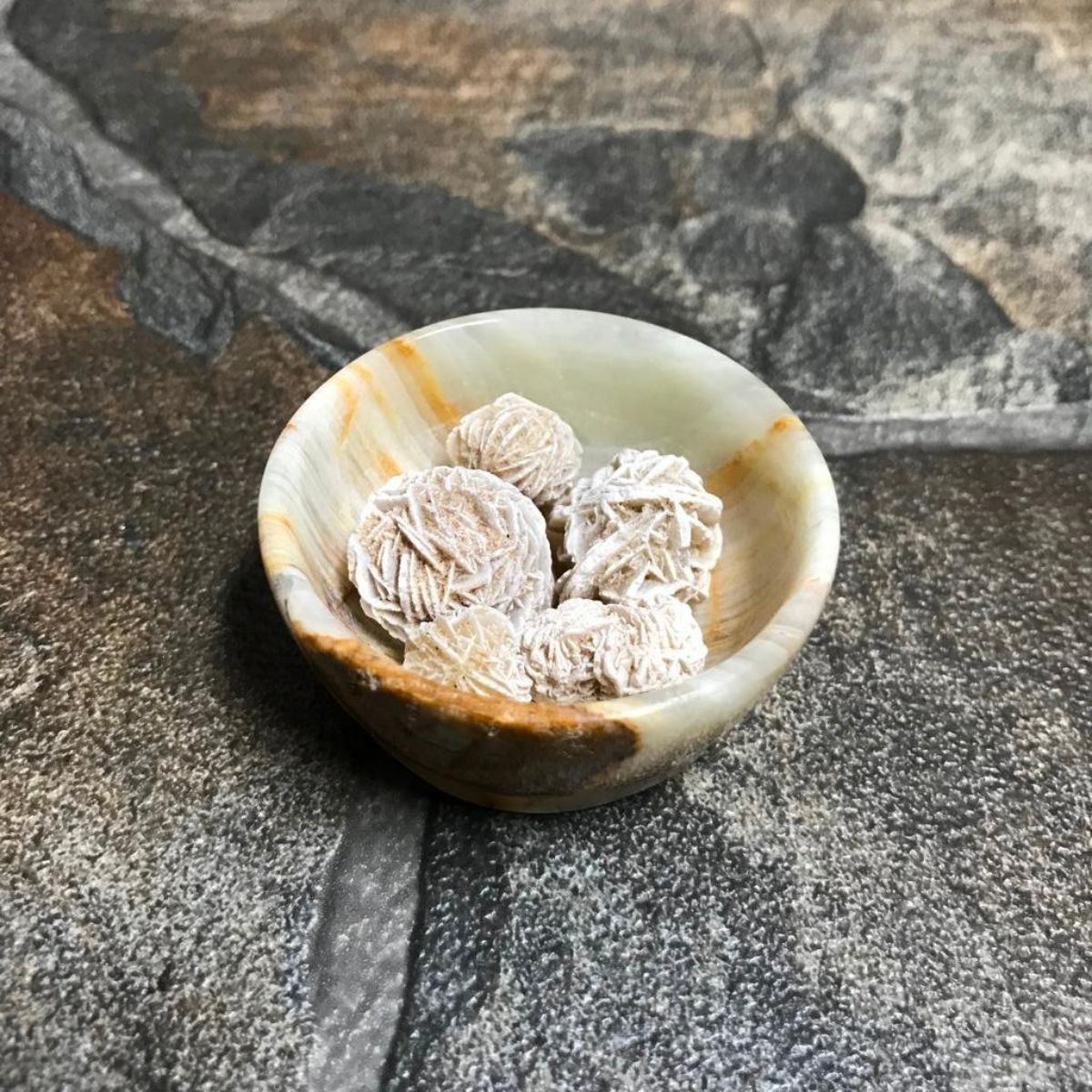 Tiny size ( 2" D ) banded onyx ( calcite ) gemstone display bowl. Hand-carved & polished in Pakistan, holding 5 small desert rose selenite formations. * Banded Agate, often called the “earth rainbowâ€,& is a healing stone for body, mind && spirit. It can increase concentration, honesty & memory. Banded Agate also protects the wearer from psychic attack, thereby preventing negative energy from harming you. * Desert Rose is a unique, natural crystal formation, a combination of water, wind & sand, also referred to as the Sand Rose, Selenite Rose or Gypsum Rose. Found in dry, desert regions, each one is said to contain a unique spirit guardian. They have traditionally been used as talismans for protection, overcoming phobias & to help boost self-confidence.