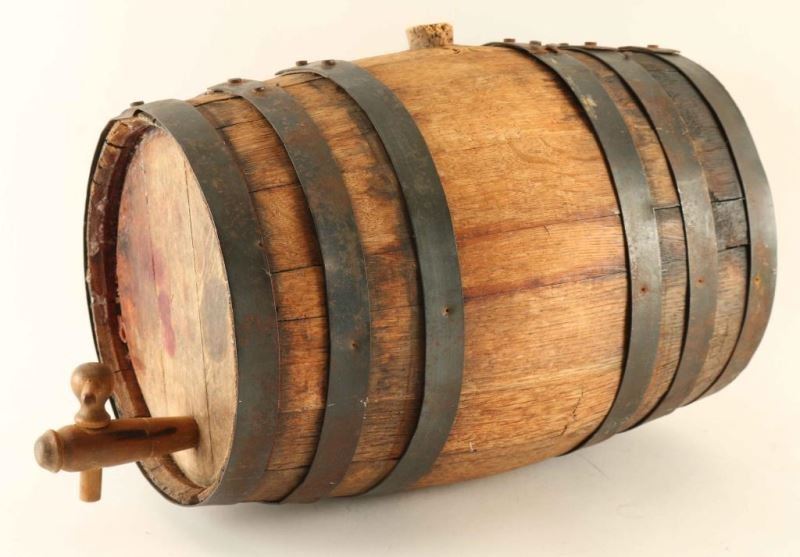 Wooden barrel with metal bands. Wooden spigot with cork on top, unmarked. Shows age and measures 13 3/4"l x 8 1/2"d.