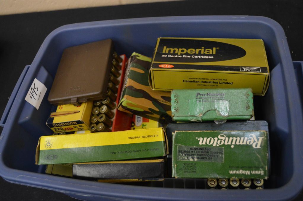 Small Blue Plastic Tub : Full of Various Full & Part Boxes of Ammo [ .223, .45 Auto, .22 Savage, .222 Rem, .30 Carbine, etc.