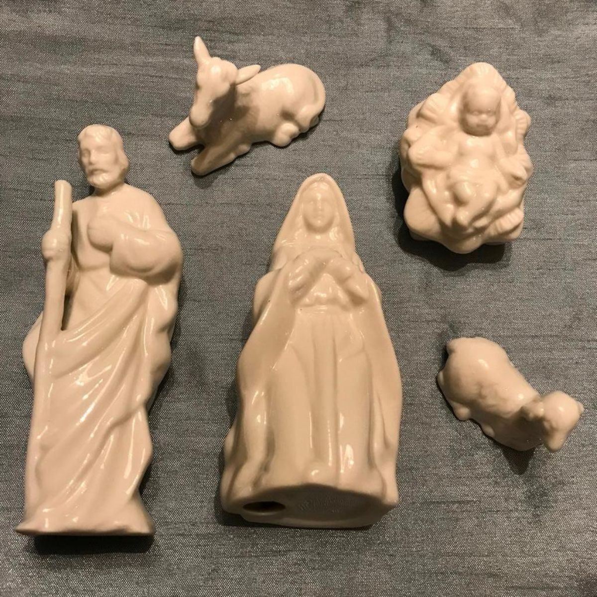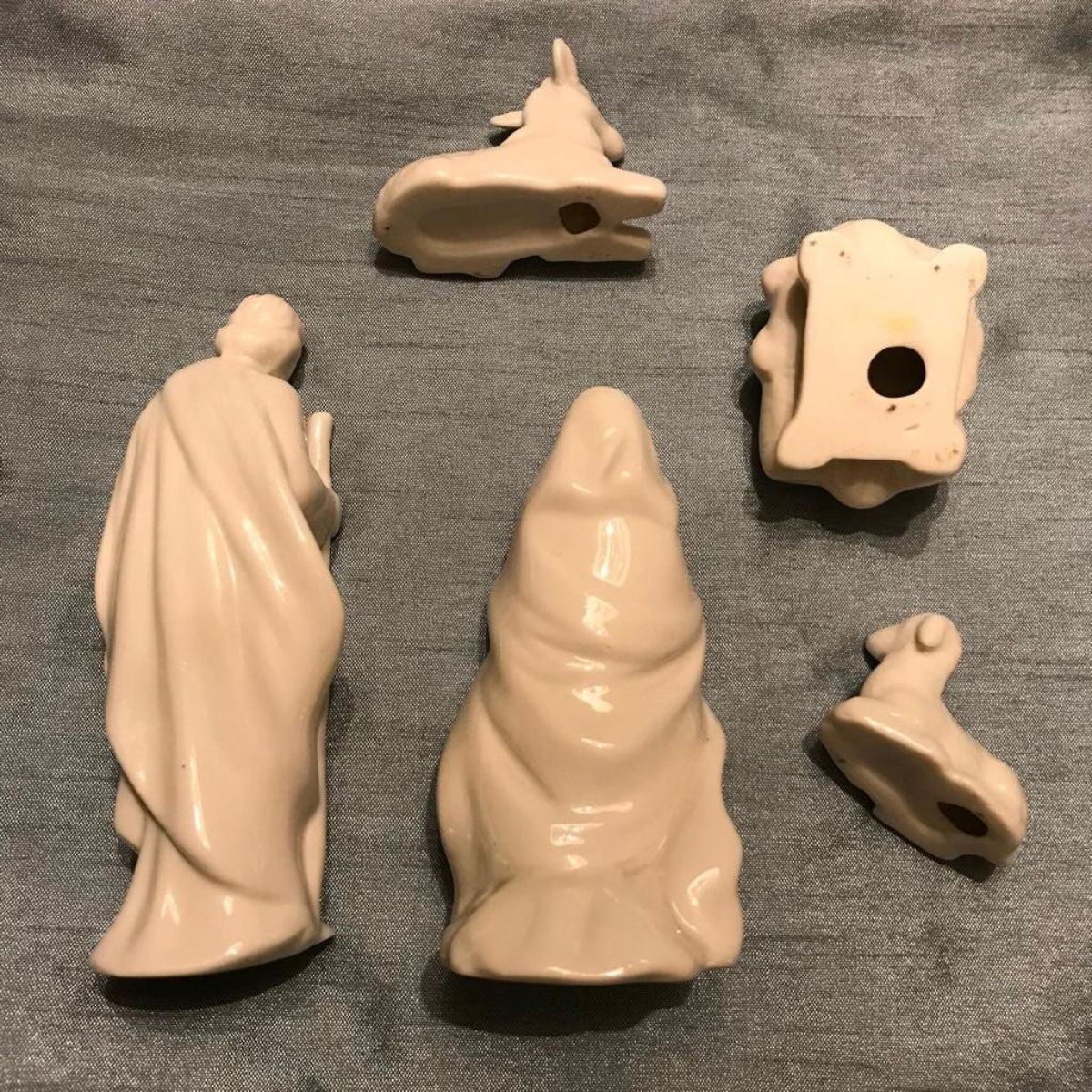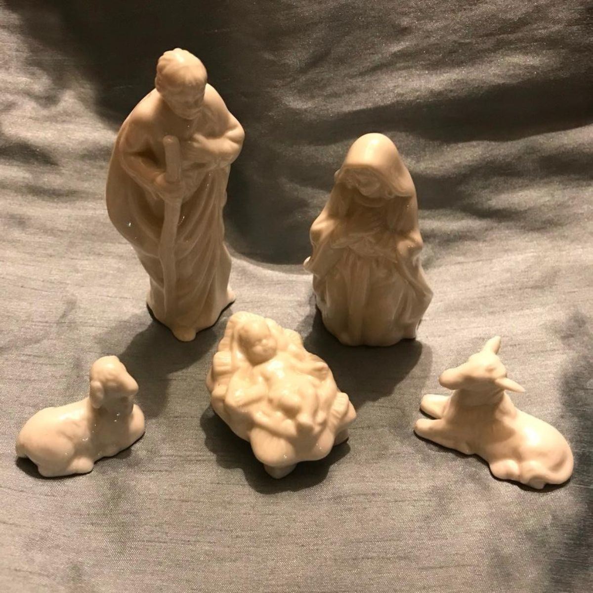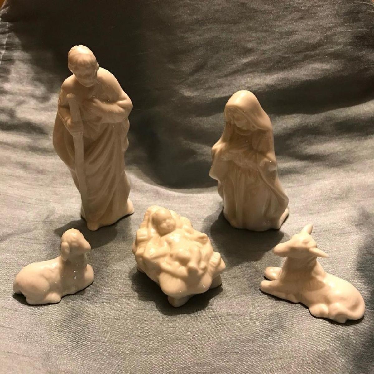 Small five-piece bone china nativity set, Jesus, Mary, Joseph, donkey & lamb. Tallest piece 4 1/2" H.Â