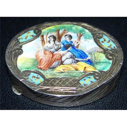 Condition: Wonderful patina on the silver. Hinge is in excellent condition, lid opens and shuts securely. Numerous surface scratches to the enamel painting. Interior gold is in fine condition.
