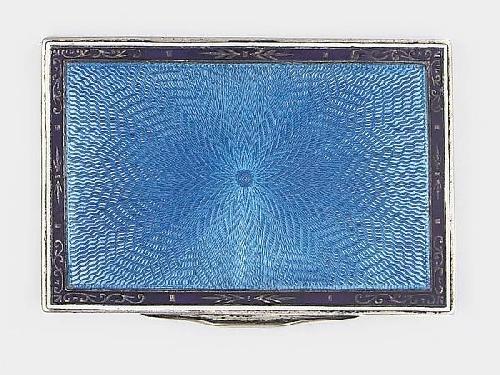Silver, 143 g, gilt interior. On the hinged cover in dark blue frame, guilloche ground there is light blue translucid enamel. Marked: Vienna, early 20th century, Franz Schmidt. Neuwirth: II/188. Size: 9 x 6 cm