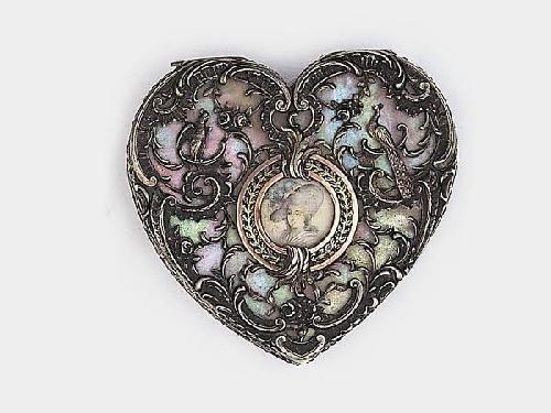 Silver, gross weight: 57 g, gilt interior. Heart shape, on the side there is pressed decoration, on the cover on mother of pearl ground there is pierced (open work), neo-rococo decoration, peacock and parrot, in gold frame painted on ivory there is a woman with heat. Engraved inscription inside: 21./11.1891. Marked: German, 800 purity, late 19th century, import mark from Prague between 1872 bad 1902. Size: 6 x 6 x 1.8 cm