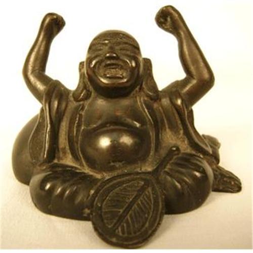 Bromze Buddah is 2" tall x 3" wide x 2.5" deep and weighs 6 oz. Statue is poised seated, long handle fan in his lap with arms above his head and an open mouth expression.