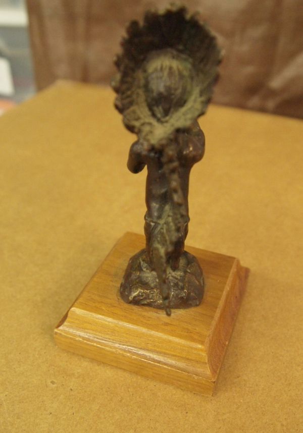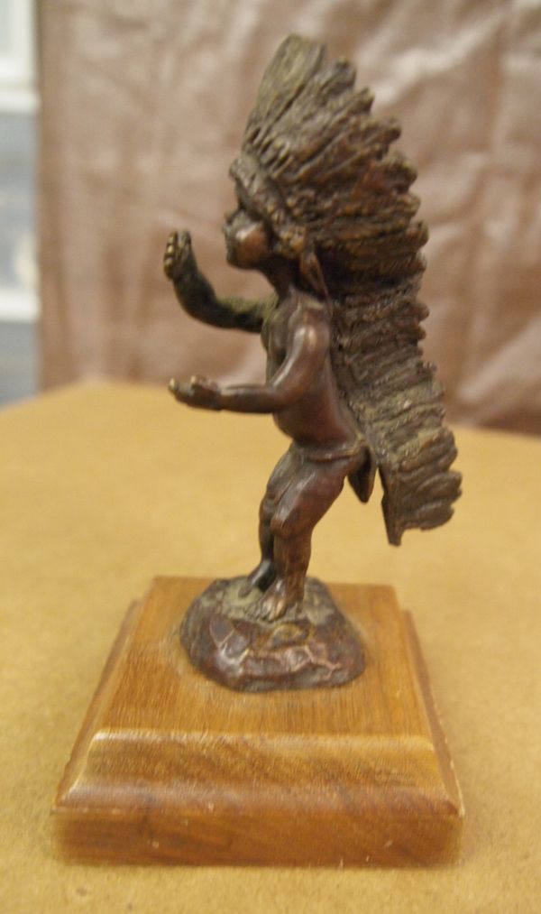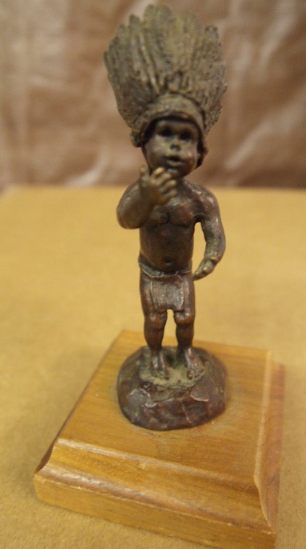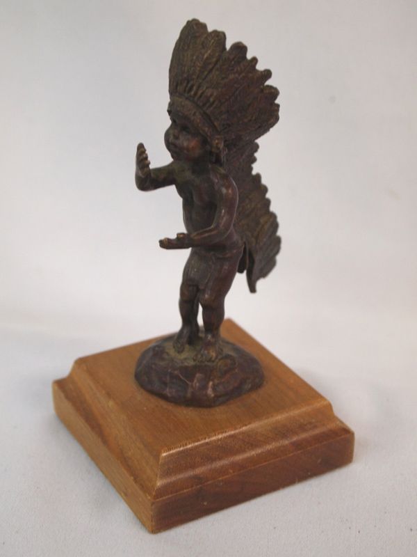 Small Bronze Indian Boy Statue. Measures 5''H x 2.5''W. On a solid wood base.