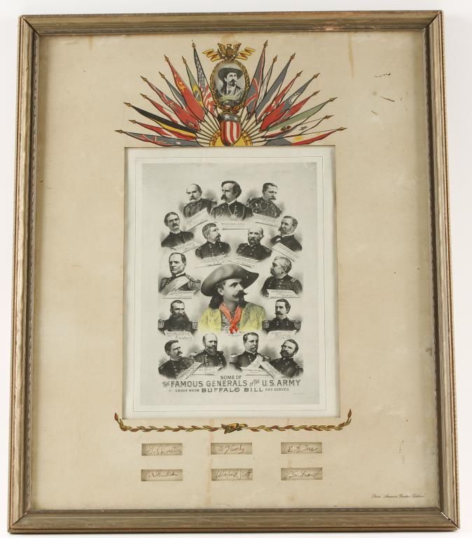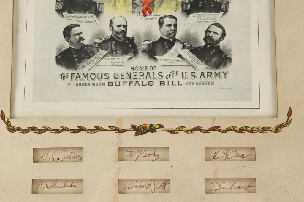 Poster titled "Some of the Famous Generals of the U.S. Army Under Whom Buffalo Bill has Served". Original matting with (6) signatures including Bill Cody, G. A. Custer, and others. Framed. 15-1/4" wide x 18" high.