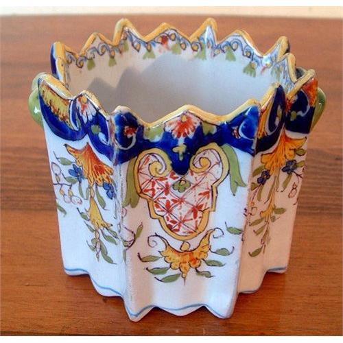 This is a rare and unusual French Faience Small Cachepot made in the Desvres region of France. The subject matter includes a small cachepot with zigzag pointed rim, having a décor of stylized patterns and flowers. The outside of the cachepot has two handles in relief. The modeling, decorating, and glaze are well done with typical colors of Desvres pottery: creamy white background decorated with bright dark blue, brilliant lemon yellow, iron red, and sage green. The inside, bottom, and the foot rim are glazed . The underside is marked FF in under glaze brown, the mark of FOURMAINTRAUX FRERES, and X and 43100 for the decorators number and the style. Desvres faience was a famous art pottery technique whereby tin glazes and decorations are applied over modeled terra cotta clay forms, and fired several times in a kiln. Please note this is not Quimper, but Desvres. Though similar, there are different color palettes used and other nuances on the two potteries. Dimensions (in inches): 3.1 Tall X 3.9 Wide X 3.9 Deep. Weight 6.8 Oz. The date is circa 1890. The item is in very good condition other than firing flaws and minor wear; there have been no repairs or restorations. Shipping and Insurance USPS Priority Mail within the U.S. is $12.00. Thanks for bidding!
