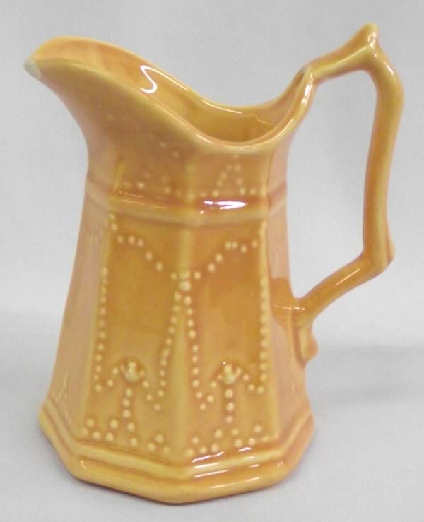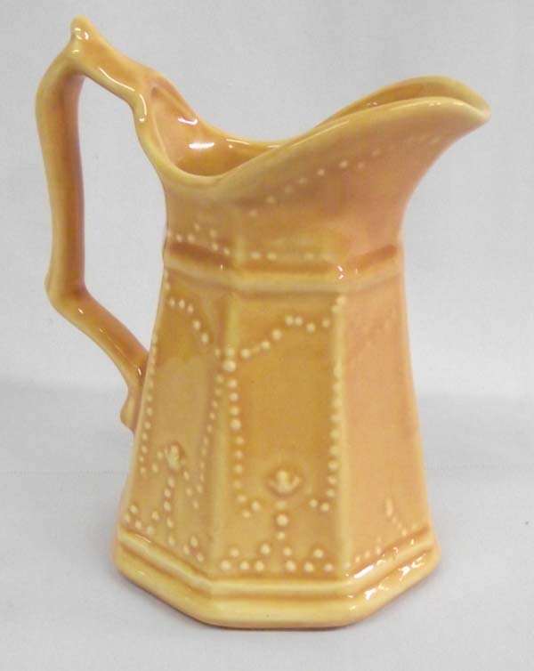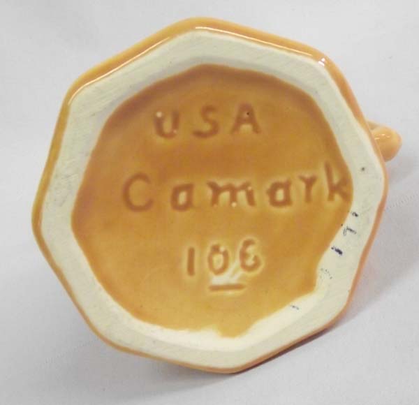 Small syrup pitcher, marked ''USA Camark''. Textured design, small chip on rim. Measures approx. 5 1/2''H x 4 1/2''W. Buyers Pay Actual Shipping and Handling Charges(see terms and conditions for more information).