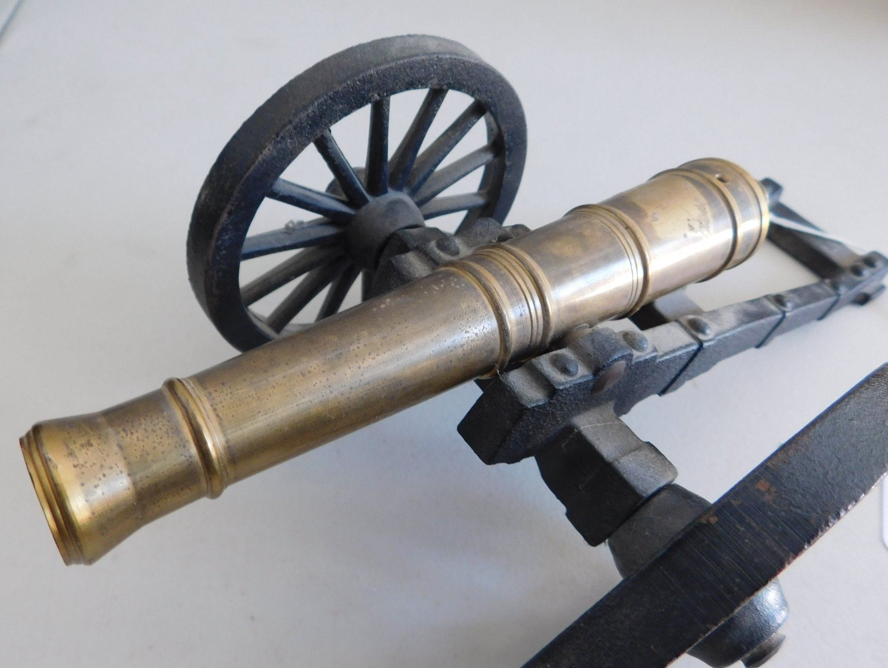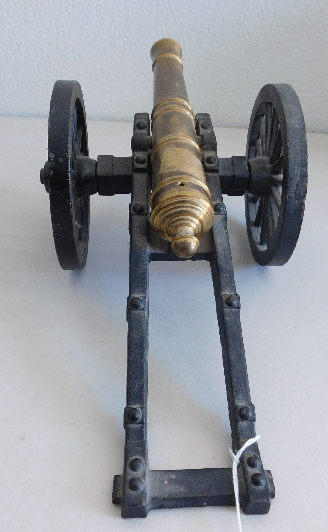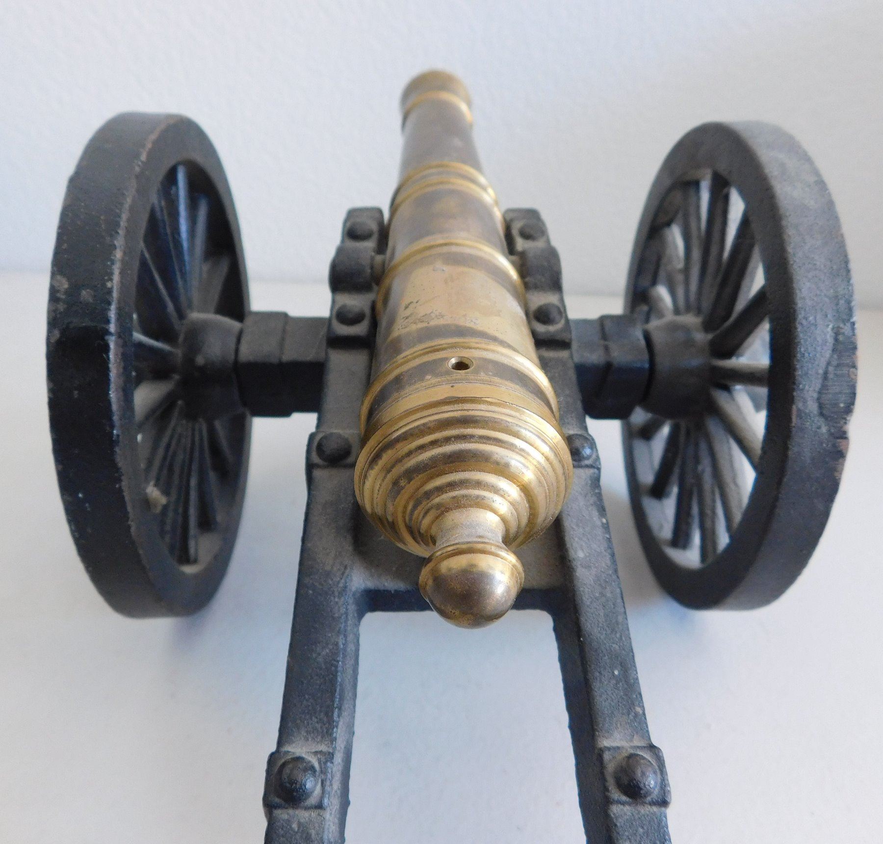 Small Cannon, 1935. Made of brass and iron, the item measures 12" x 5.5" x 4.5". Copy of a Civil War cannon. Made in USA, weighs 5.5 pounds. Condition: Good, see images. Shipping: $34.50 w/insurance and signature, due to size and weight.
