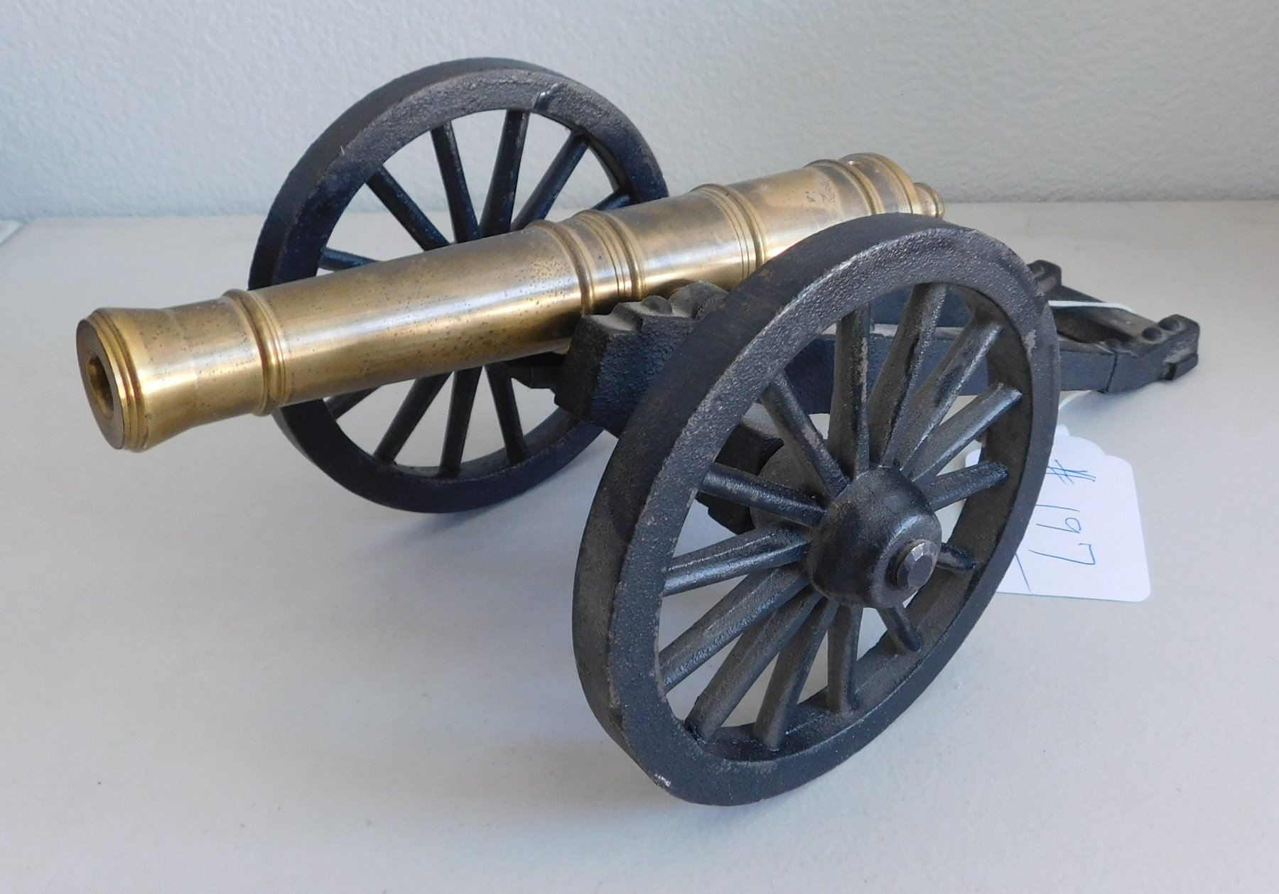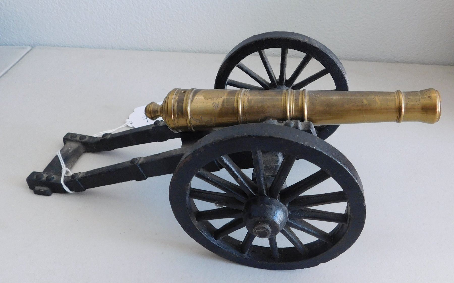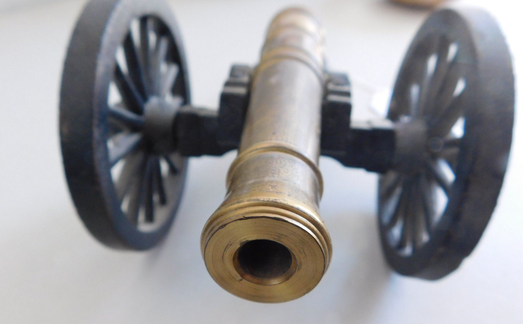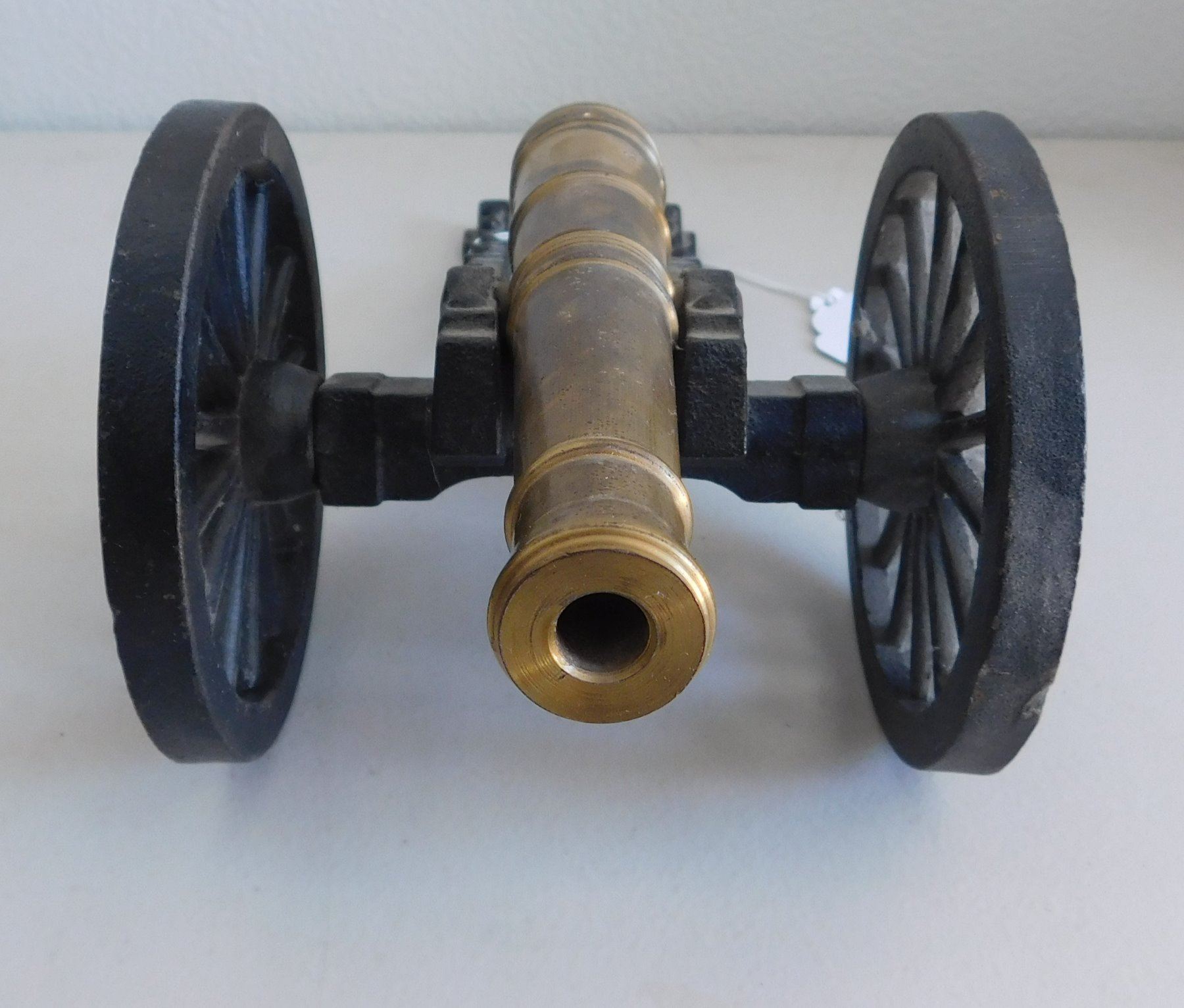 Small Cannon, 1935. Made of brass and iron, the item measures 12" x 5.5" x 4.5". Copy of a Civil War cannon. Made in USA, weighs 5.5 pounds. Condition: Good, see images. Shipping: $34.50 w/insurance and signature, due to size and weight.