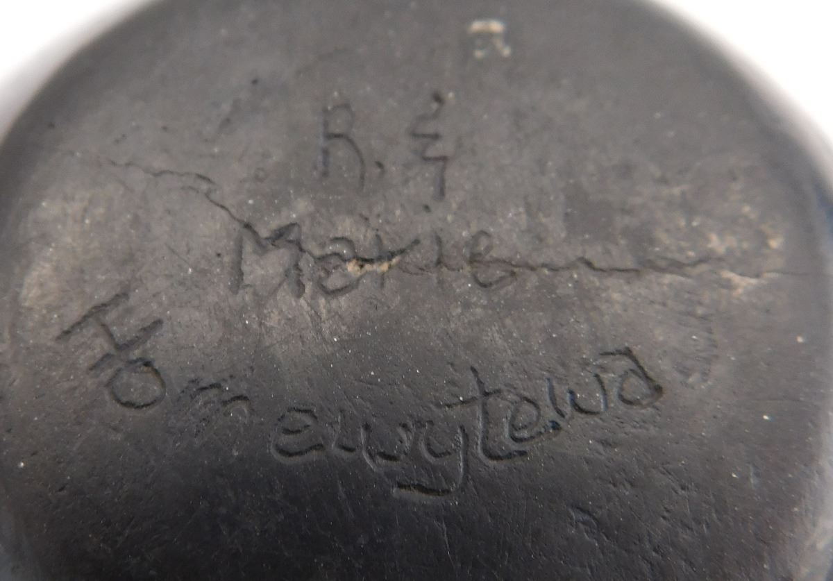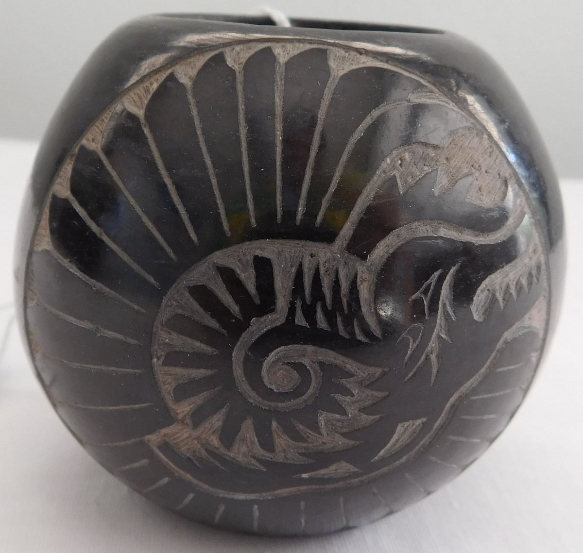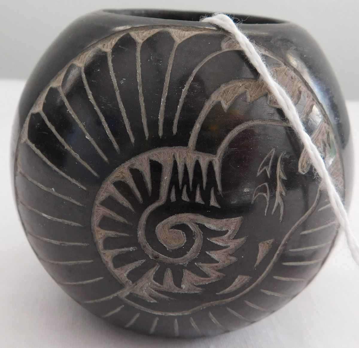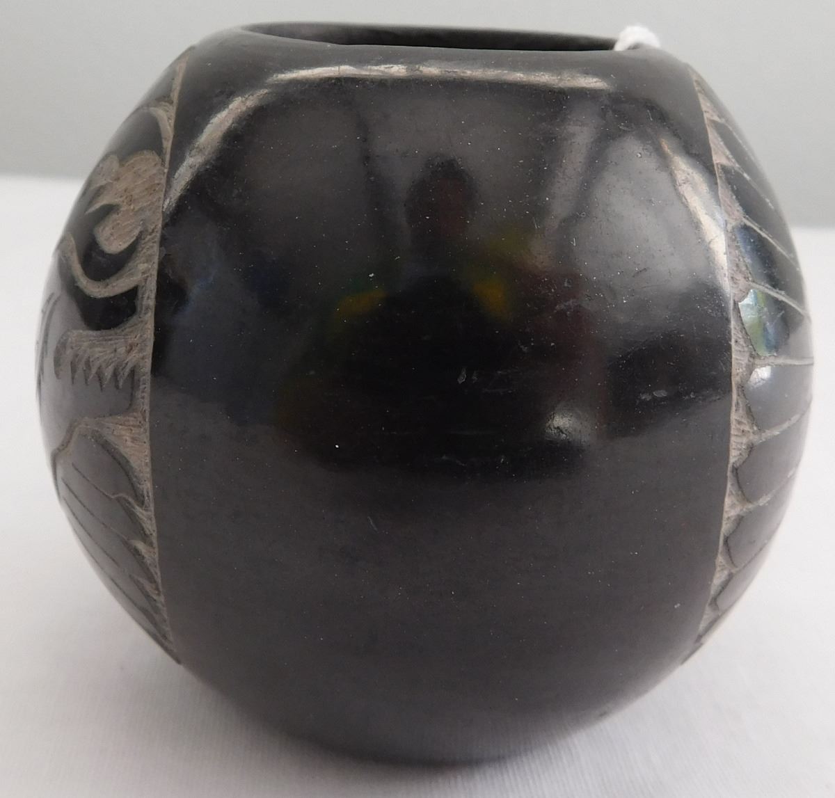 Small Carved Olla, 20th century item. Made of clay and paint, this item measures 2.5" x 2.25". Tewa, Arizona. Dragon design, signed R + Marie Homewytewa. Condition: Good, see images. Shipping: $18.50.