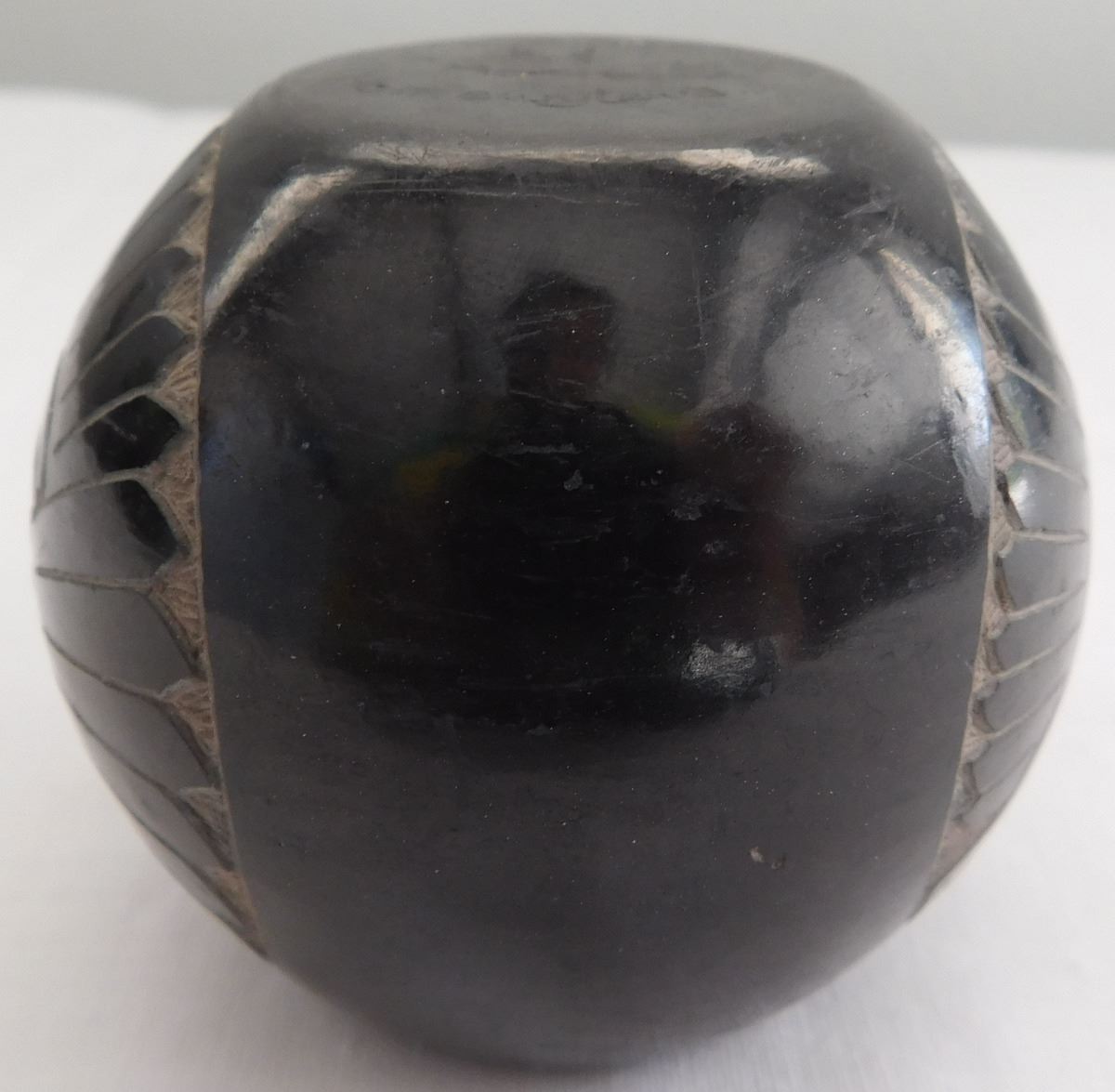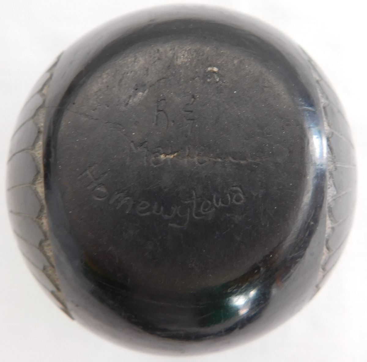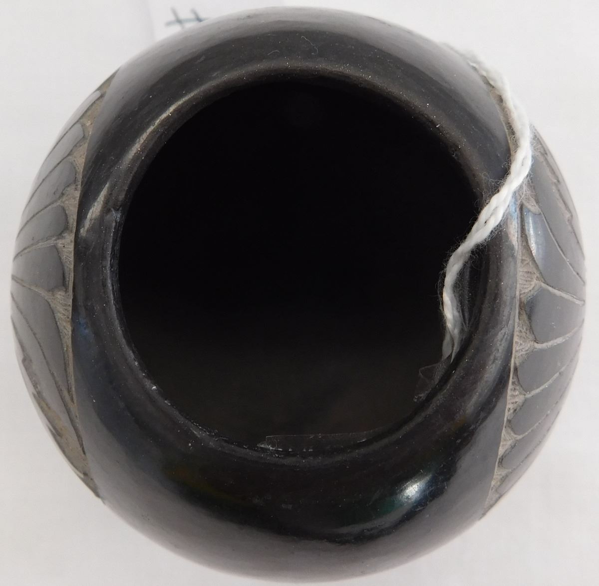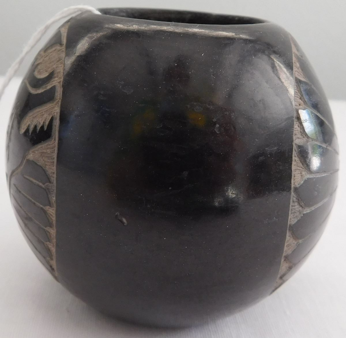 Small Carved Olla, 20th century item. Made of clay and paint, this item measures 2.5" x 2.25". Tewa, Arizona. Dragon design, signed R + Marie Homewytewa. Condition: Good, see images. Shipping: $18.50.