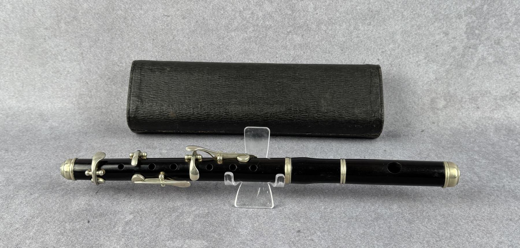 No maker mark, flute is made of ebony. 11 1/2" long assembled.