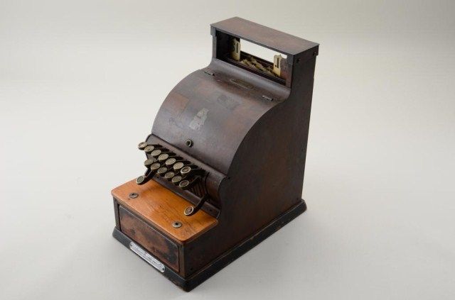 Small Cash Register up to $1 denomination, National Cash Register ID plaques, plain sides; glass broken; ready to polish and restore. Est.: $150-$300.