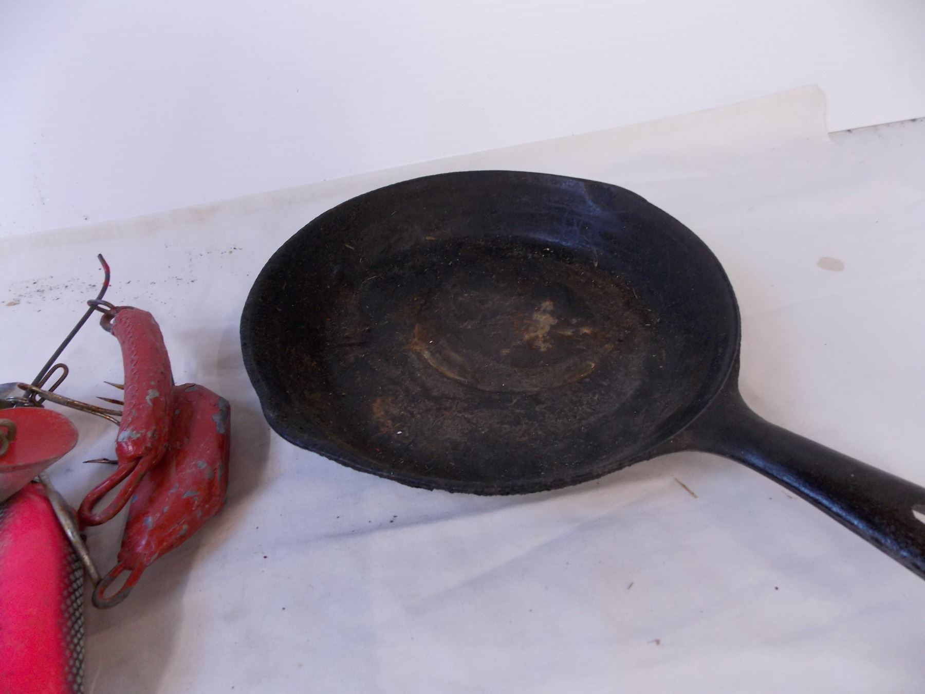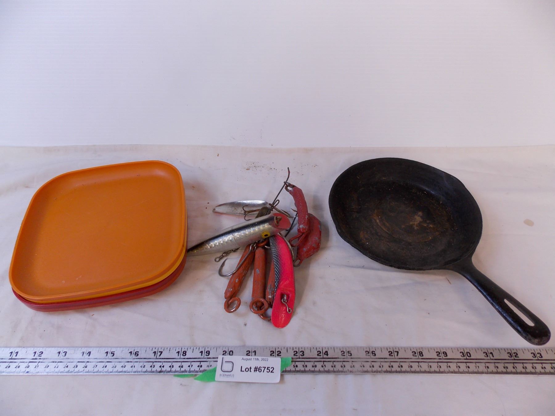 Small Cast Iron, (4) Camping Plates, Fishing Lures + Weights