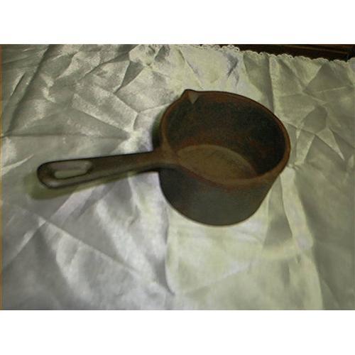 Small Cast Iron Pot Stamped LODGE. This says 2 MP with LODGE with a frying pan as the O in lodge. Has some other letters on it, and hard to make out. It has a pour spout and is very old, and still in very nice condition. You can clean it and put a little oil in it, and cook off it, it is that nice. Has that rustic look, but it is not at all. Just looks that way. It is 3" H X 4.5 " W and just a real nice small old cute one. Hope you like it. LOWERED RESERVE TO SELL.