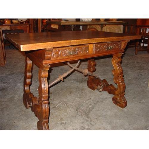 This is a Catalane style table from France, constructed in the 1920's or so. The top is supported by two brackets. We recently stripped the top on this table, because it had unsightly marks and scratches. The two drawers are decorated in elaborate C scrolls and florets, which are seperated by a stationary post. This rests upon S scrolled legs, serpentine stretchers and voluted feet. A curved iron stretcher holds it all in place.