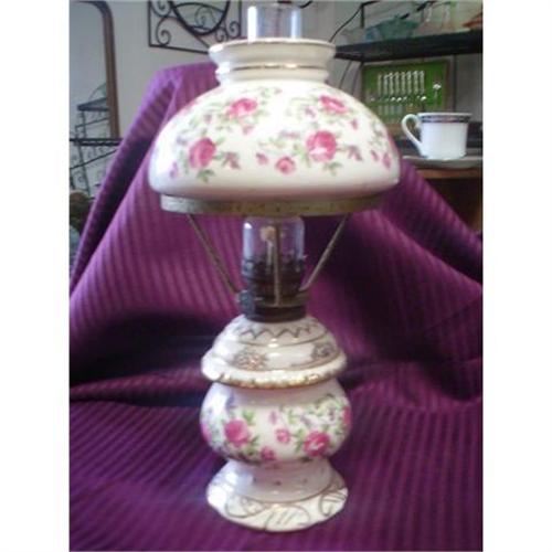 This is a very pretty little oil lamp. It measures about 11" high from the base to the glass chimney. The globe is about 6" wide and the base is 3" wide. Both the globe and the base is white porcelain and painted with dark pink roses and trimmed in gold. There is some crazing on both the globe and body but it is overall good condition.