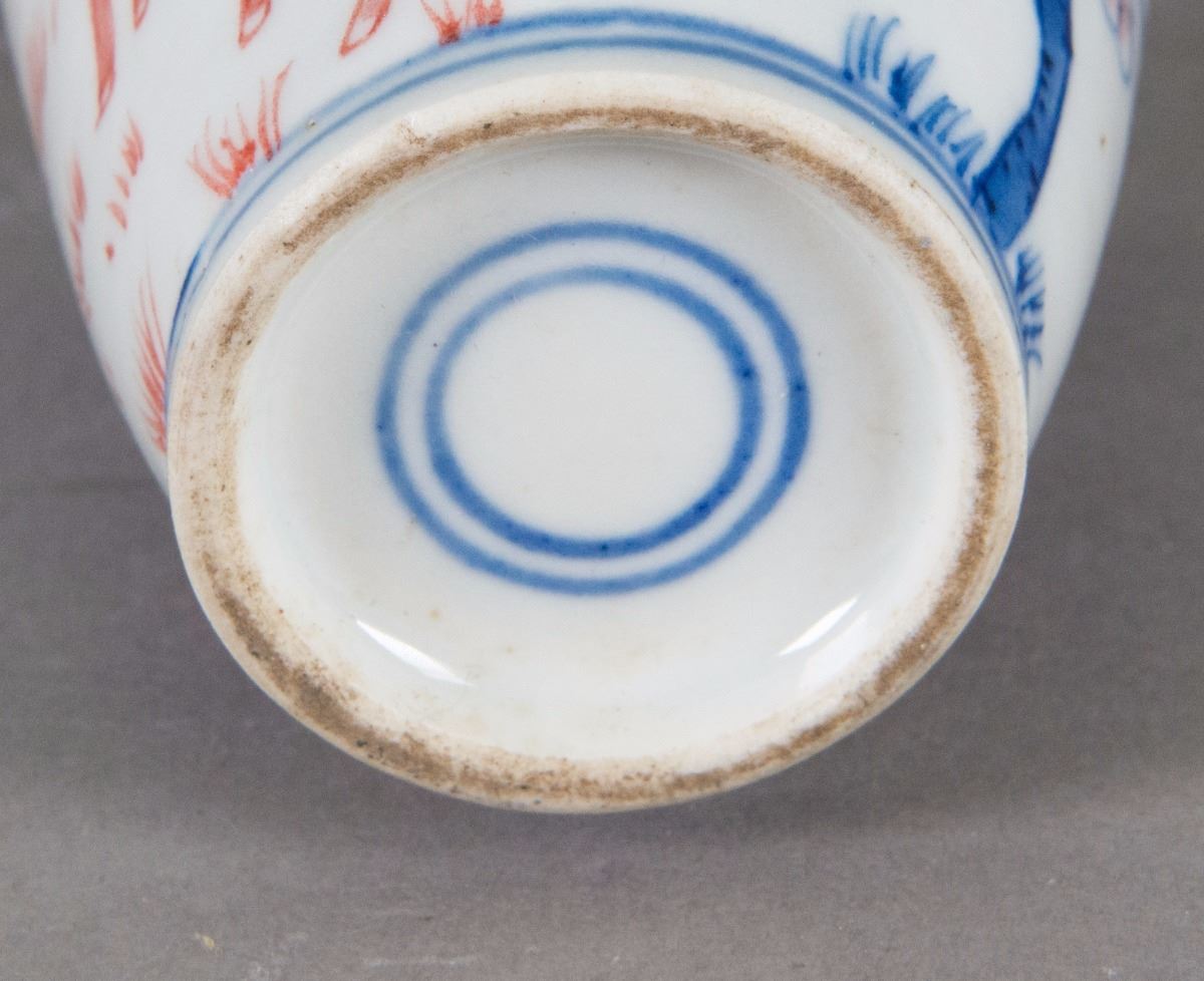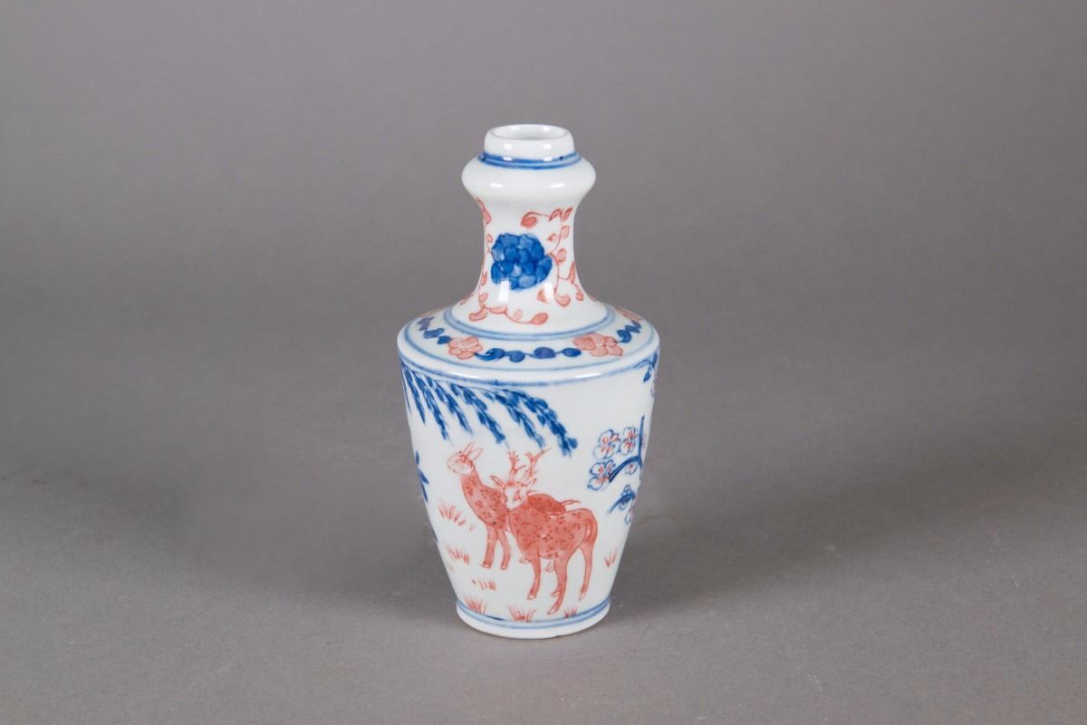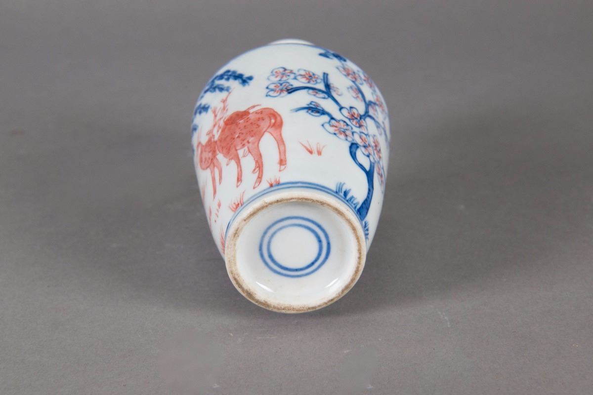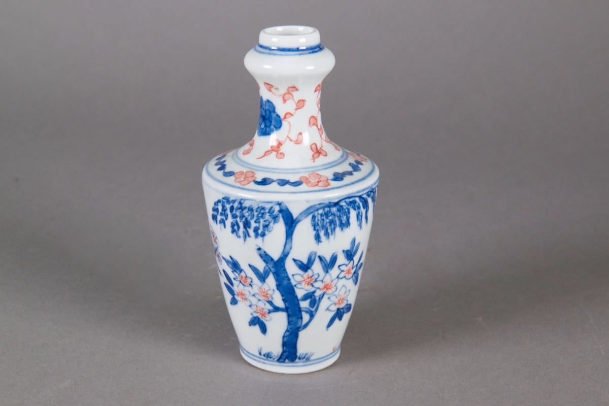 Small Chinese Famille Rose porcelain vase; of baluster body form; featuring plum blossom trees; double-circle mark on base; H: 14 cm, D: 7 cm, 207 grams