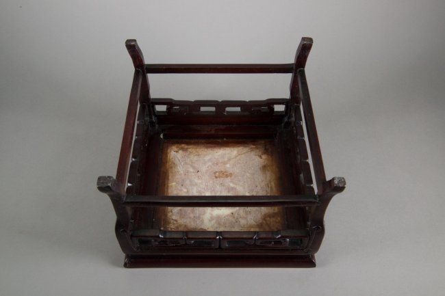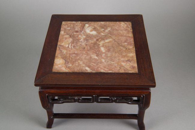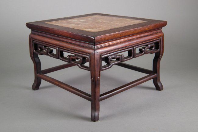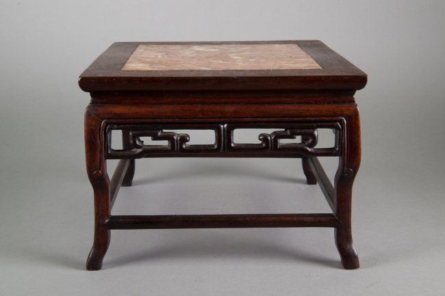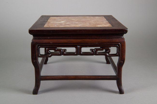Small Chinese wood carved table stand; with inset square marble on top; supported on four legs with decorative openwork key-fret design below table surface; H: 17 cm, W: 23 cm, 1745 grams