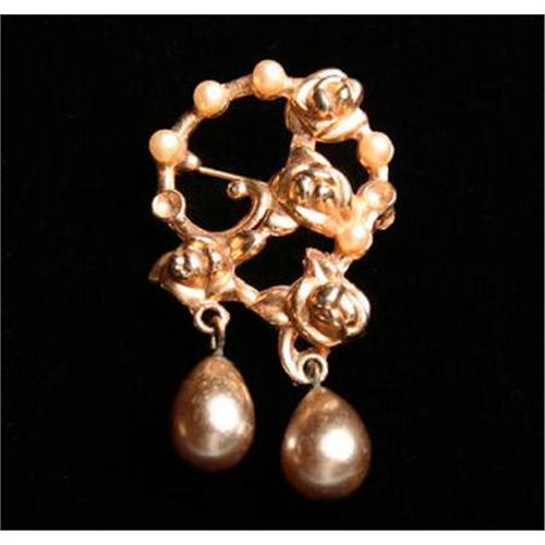 A central gold circlet is set with pearls and crossed diagonally with a gold vine and roses, two gray pearls dangle from the bottom. Length (with dangling pearls): 2", Width: 1 3/16".