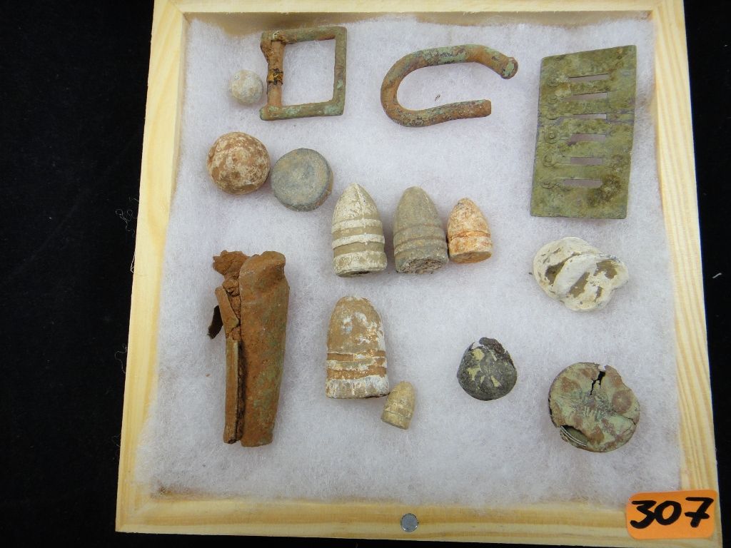 Nice wooden, glass front case with an assortment of Civil War relics dug years ago in Chesterfield County, VA.