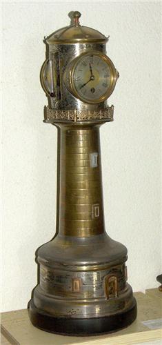 Pendule en bronze (L'industrie), env. 1900, en forme de phare avec tour rotative, montre, baromètre et thermomètre