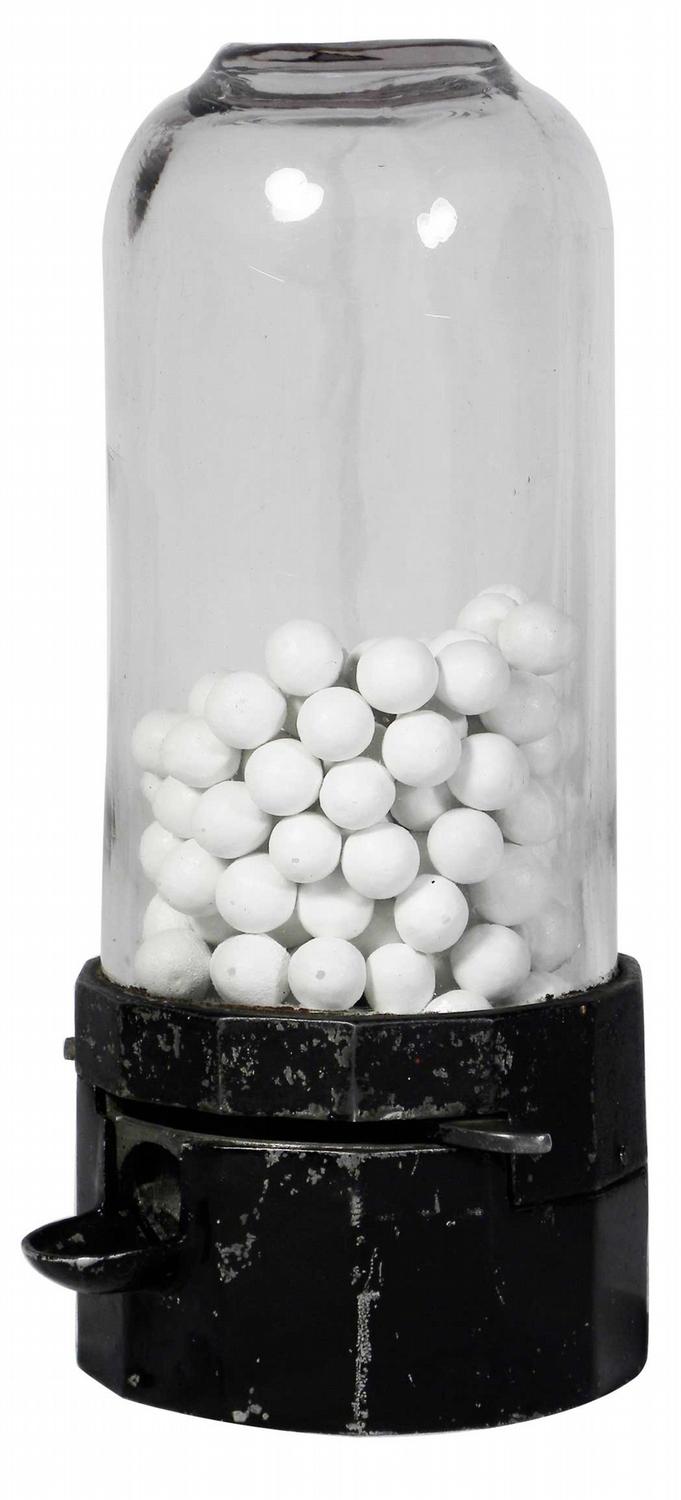 Small Coin Operated Gumball Machine. Aluminum and glass. Very good original working condition, comes with key. 5 X 10 1/2 X 5 inches.
