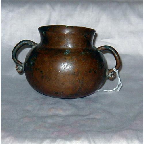 Small but heavy primitive copper/bronze pot or bowl with handles and round bottom. Could be arts and crafts/hand made. It has some green inside, black marks and dents. One side has small crack in handle. It was definitly used. Buyer pays shipping and handling costs.