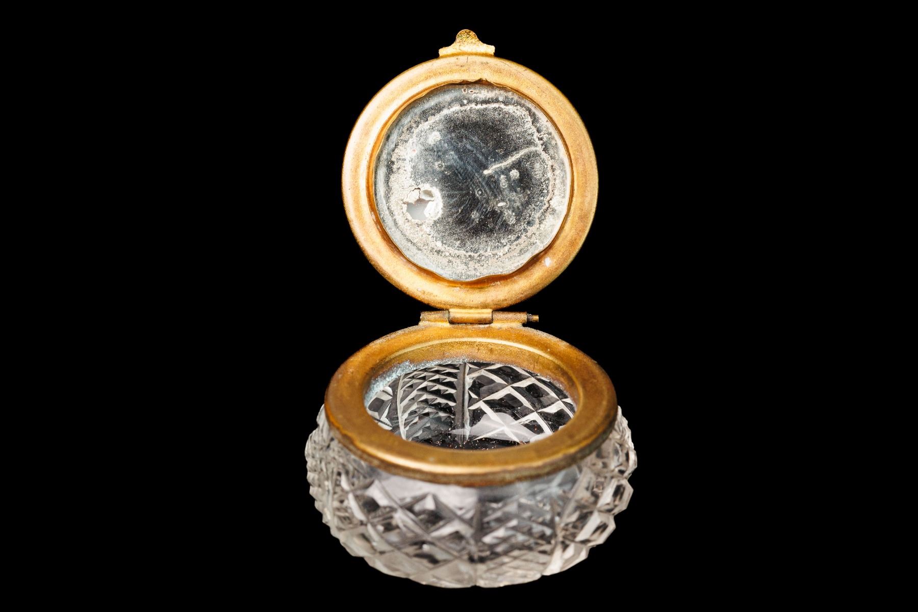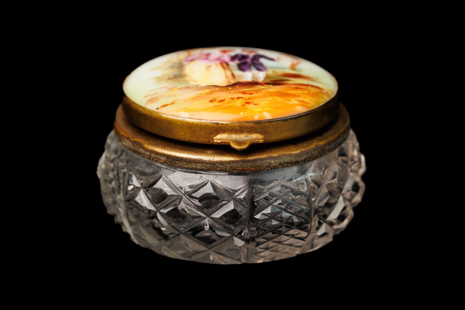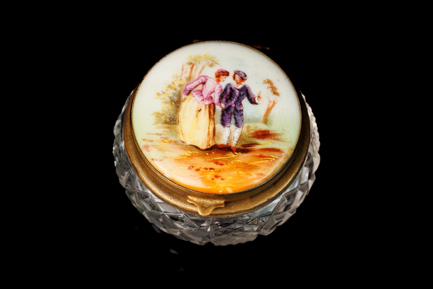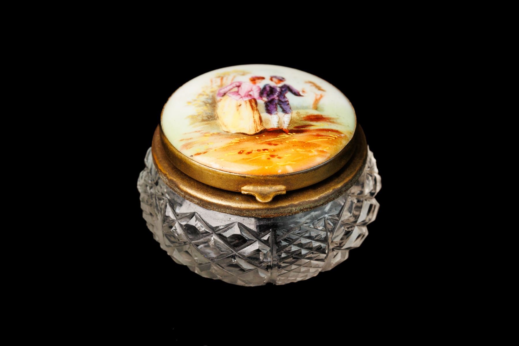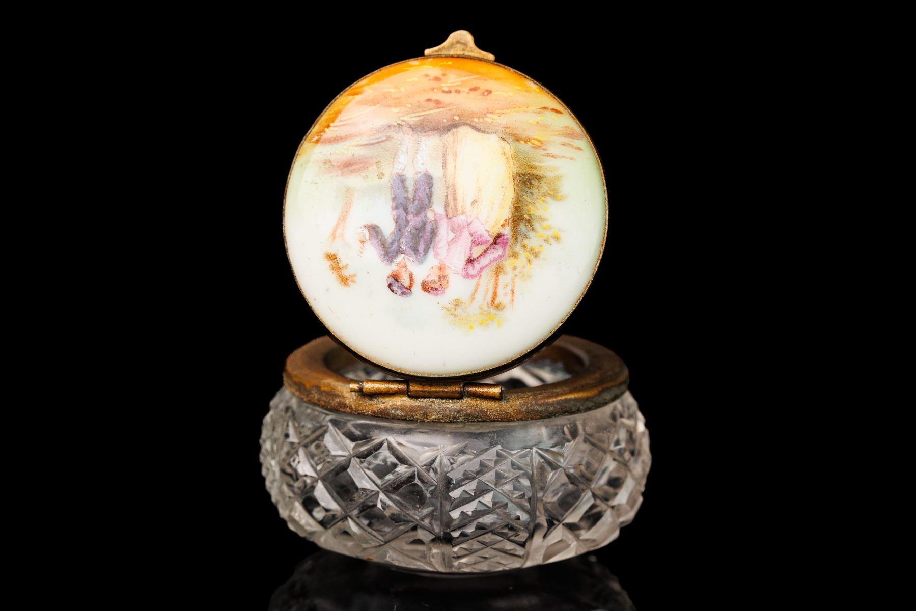 The pill box has a metal rim and a porcelain lid with handpainted gallant scene. Europe, 20th century. The size 4,5 cm. There is a defect on the back side of the lid