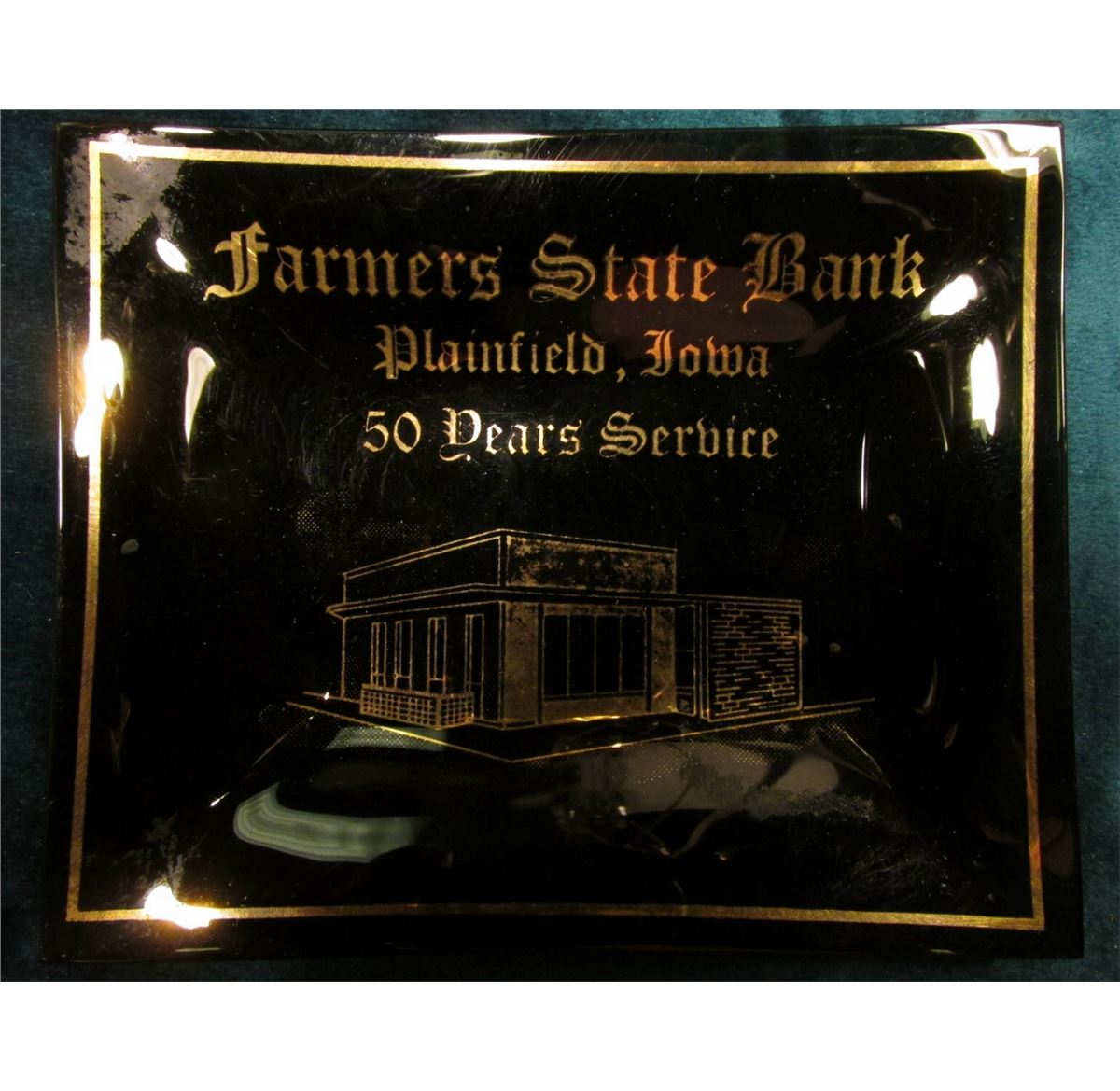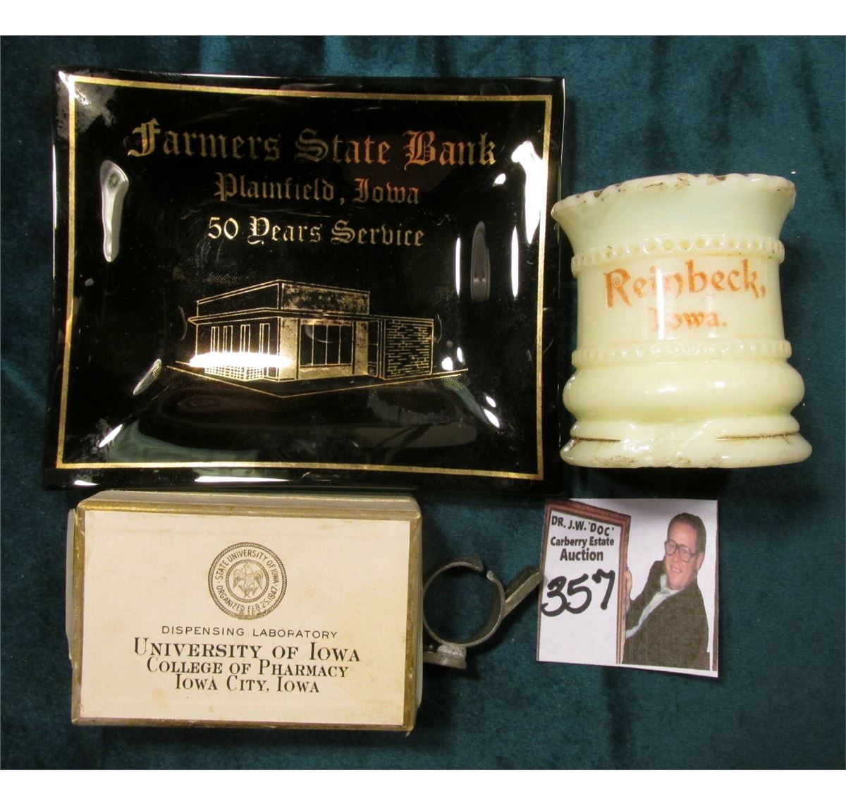 Small Custard Cup, White Glass "Reinbeck, Iowa." Large chip at base; Small Cardboard Box "State University of Iowa/Organized Feb. 25, 1847", "University of Iowa/College of Pharmacy/Iowa City, Iowa" folded paper inside may have originally held slides; lead or pewter Ring Casting (cut); & a small black glass tray with gold lettering and trim "Farmers State Bank/Plainfield, Iowa 50 Years Service".