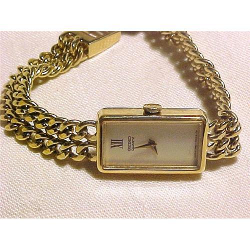 Dainty & Stylish rectanglular case Seiko Bracelet Watch. The case measures 3/4" x 7/16. The watch with a bracelet band measures 6 3/8 long. <p> The condition is good. There ar a few very microscopic scratches to the case there and there that are really not noticeable. <p> The watch is working excellently and comes with a brand new working quartz battery.