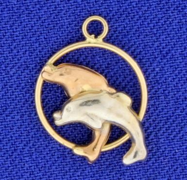 In 14K rose, white and yellow gold, the dolphins in rose and white gold surrounded by yellow gold hoop. It is 5/8 inch long. .2g