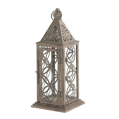 Small Eclipse Candle Lantern **|**|** Youll admire this gorgeous candle lantern day and night, with and without light. The antiqued pewter-like finish of the metal frame is highlighted by the intricate cutout patterns on the top and all four sides. Clear glass panels let the light of your candle shine through. Item Weight: 1.6 lbs. 5 x 5-1/8" x 12-1/2" high. Iron and glass. 1 EA"