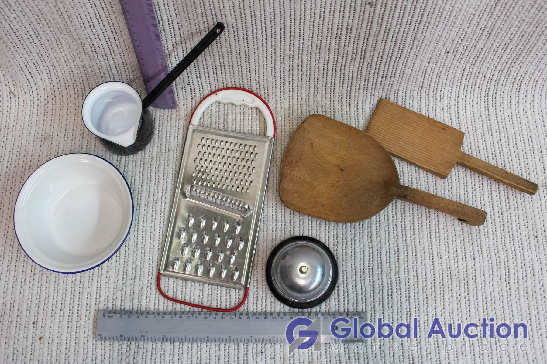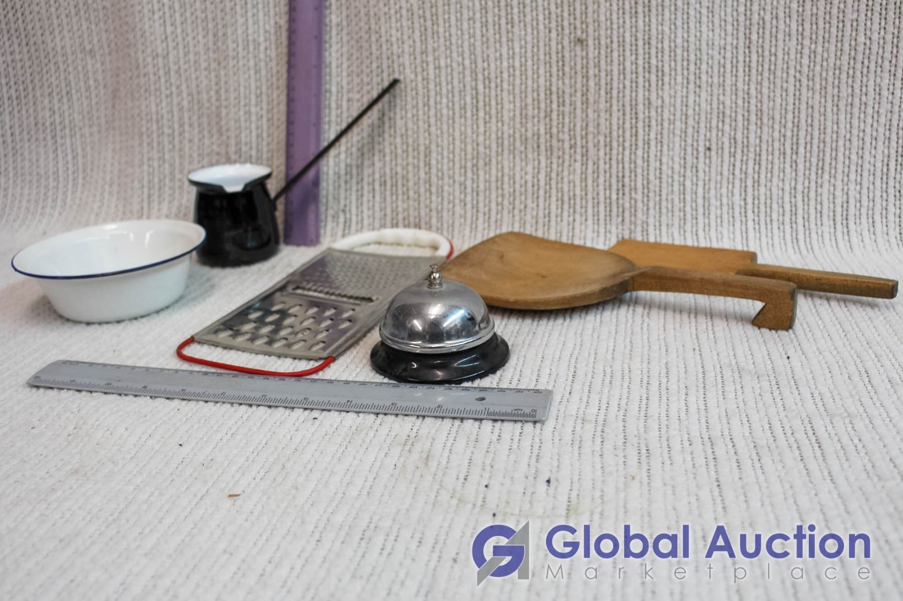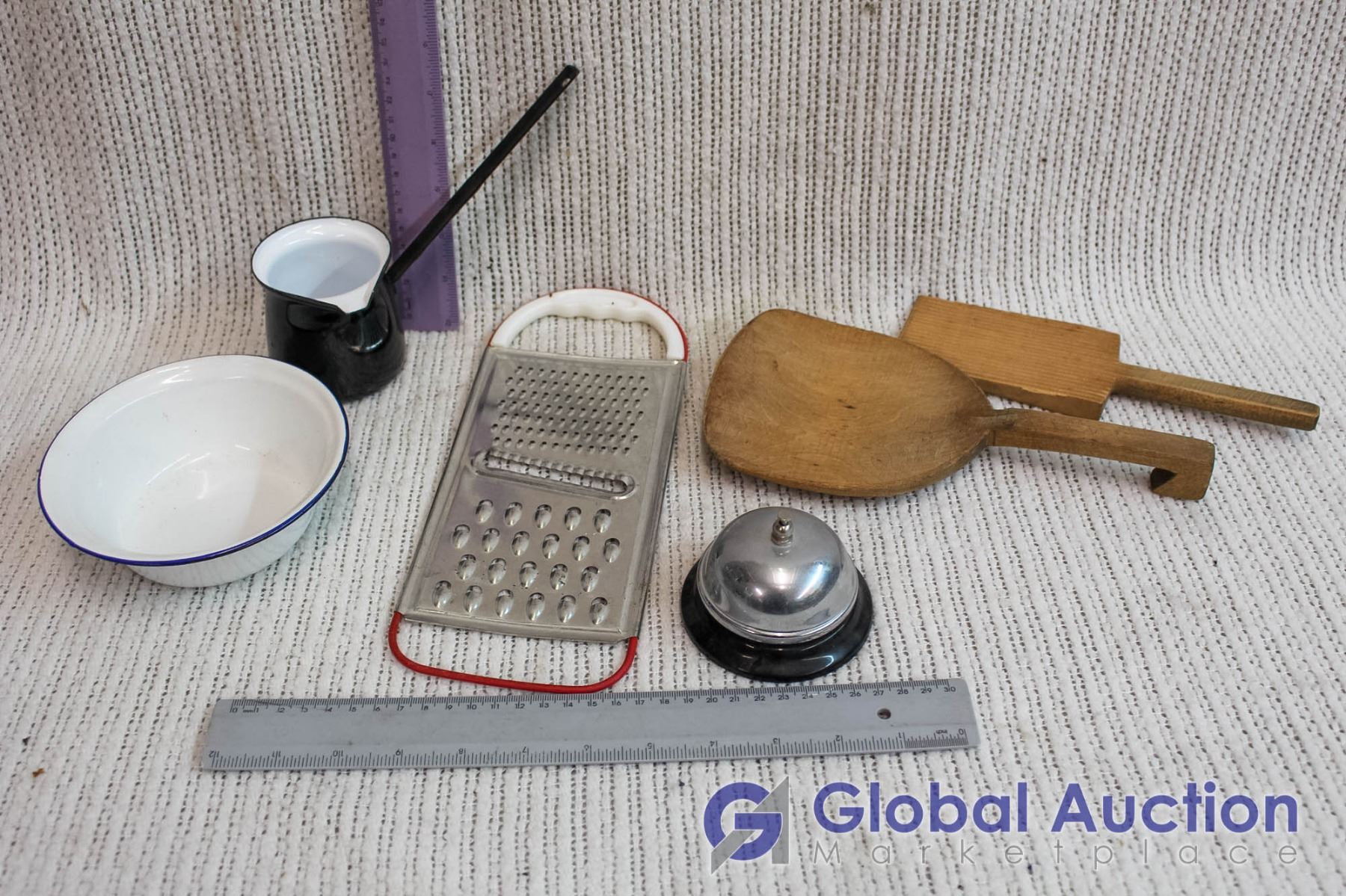 Small Enamelware Bowl, Enamelware Dipper, Desk Bell, Wooden Butter Paddles, Cheese Grater