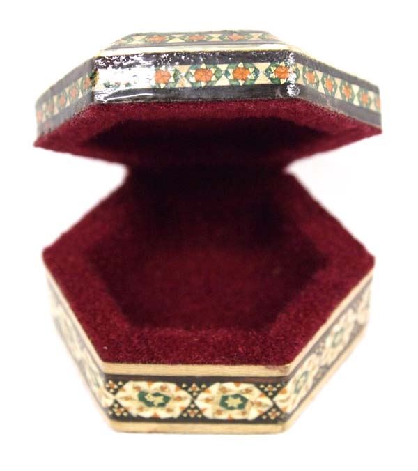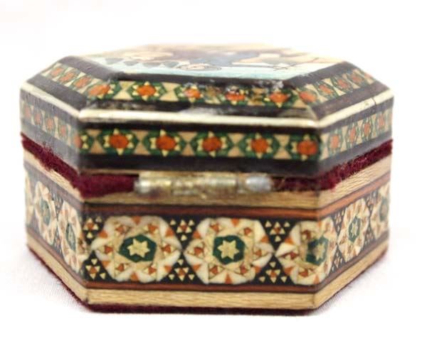Small Ethnic Laquered Lidded Trinket Box, red velvet lined, hinged lid, velvet lined base, measures 3''D x 1.5''H