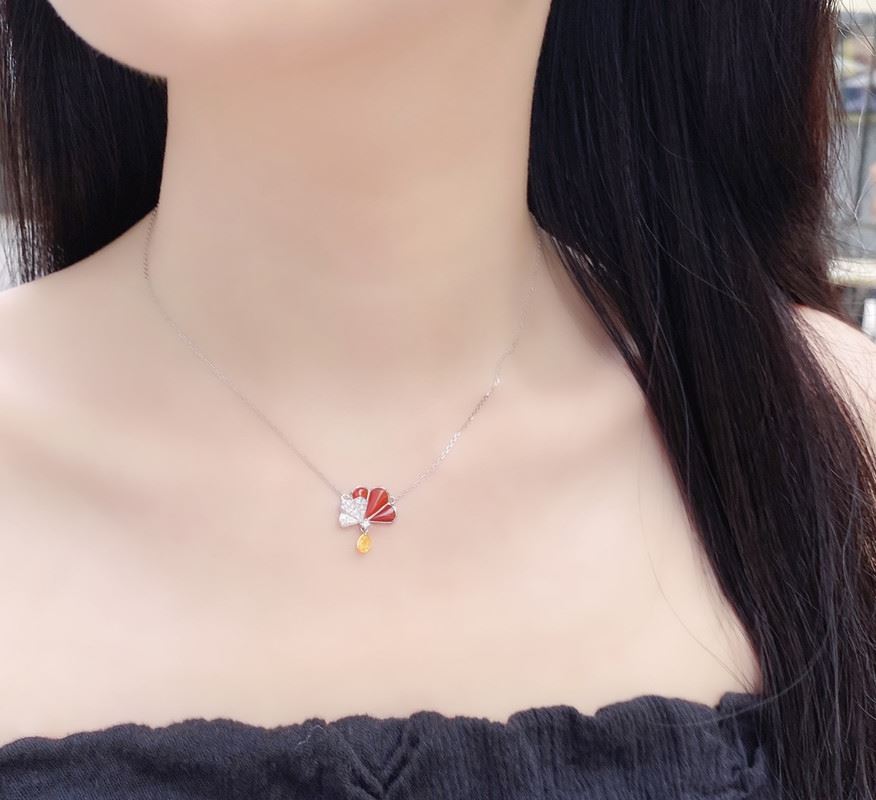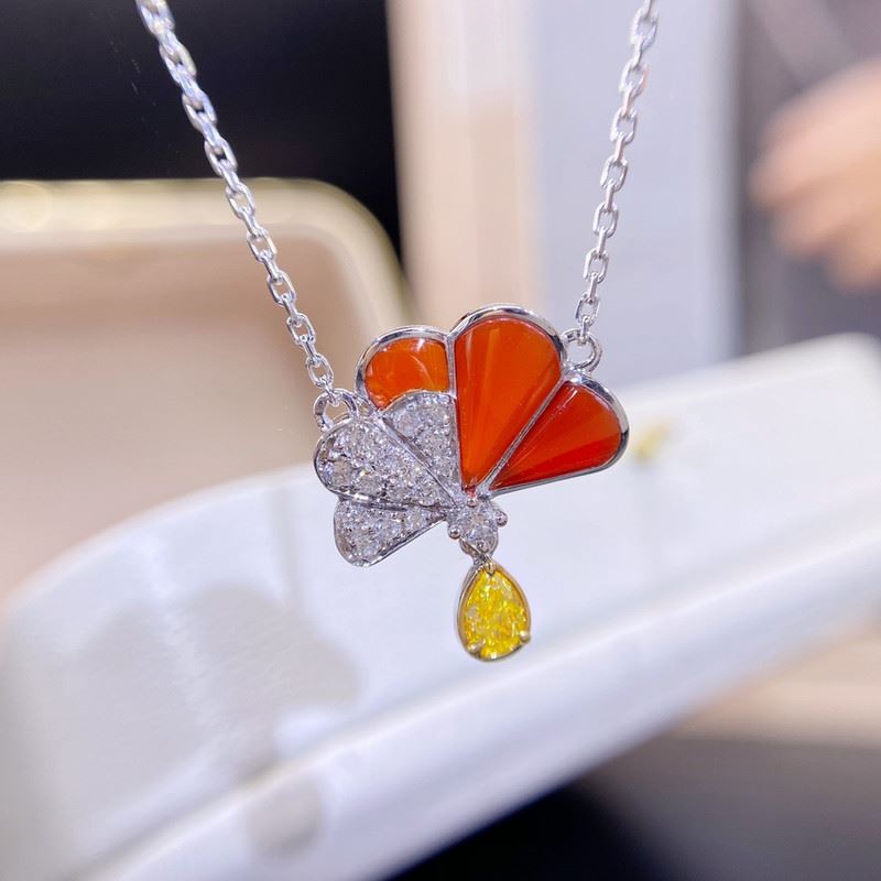 This small fan necklace features a delicate fan-shaped design, creatively combining red coral and diamonds. A dazzling yellow gemstone hangs elegantly at the bottom. The warm hue of the red coral contrasts beautifully with the bright yellow gemstone, while the diamonds add an extra touch of luxury. The overall design is playful yet refined, exuding unique charm and sophistication. Main diamond: 0.162 ct, side diamonds: 0.134 ct.Note: Comes with a precious metal authentication certificate.
