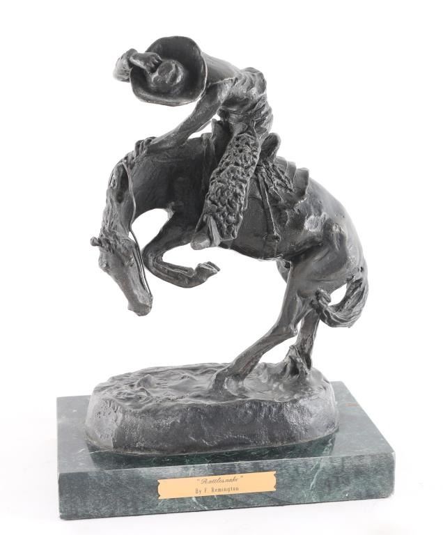 By famous cowboy artist Frederic Remington entitled "Rattle-Snake" signed on base, mounted on black marble base. Measures 12x9"