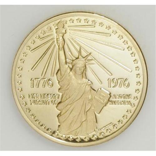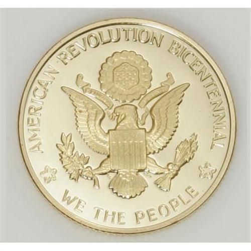 <B>Small-Format 1976 Gold National Bicentennial Medal.</B></I> This official small-format gold American Revolution Bicentennial commemorative medal is carefully preserved with excellent contrast. One side shows the eagle motif from the Great Seal, while the reverse has a half-length image of the Statue of Liberty. Total gold weight is nearly one-quarter of a troy ounce. Comes with wooden box, blue outer box, and small fold-out information sheet.<BR><BR><b>Shipping:</b> Coins & Currency (<a target="_blank" href="http://www.heritageauctions.com/common/shipping.php">view shipping information</a>)