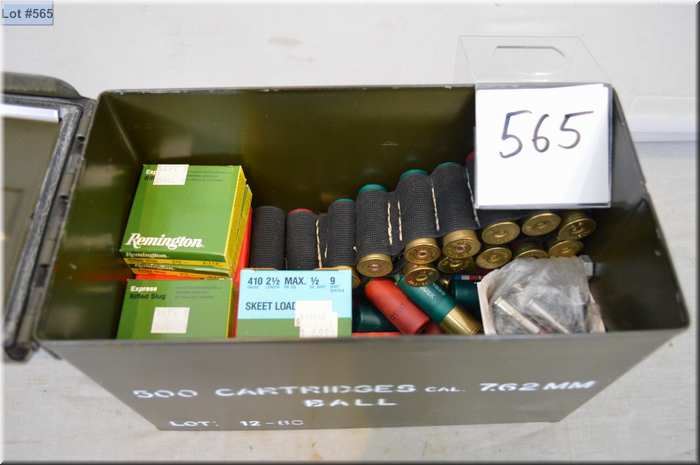 Small Green Metal Ammo Box : Approx. 8 Boxes 7.62 Tokarev ammo - asstd .12 Ga shot shells & slugs - 10 rnds Milt Ammo in brass clips - 25 rnds .38 Spec ammo - 15 .410 Ga Slugs - Box .410 Ga 2 1/2" - Loose .38 Spec ammo, etc.