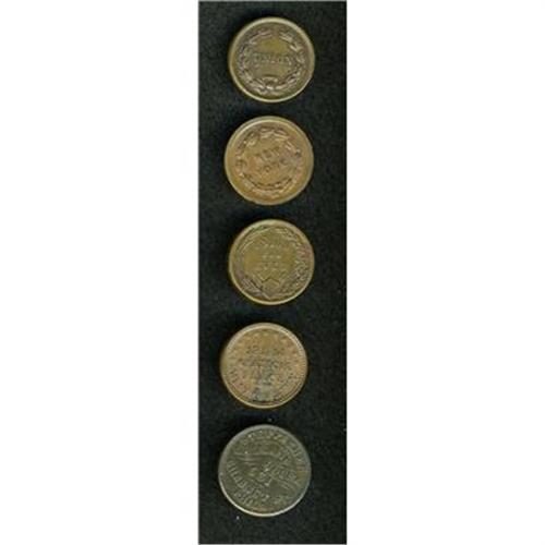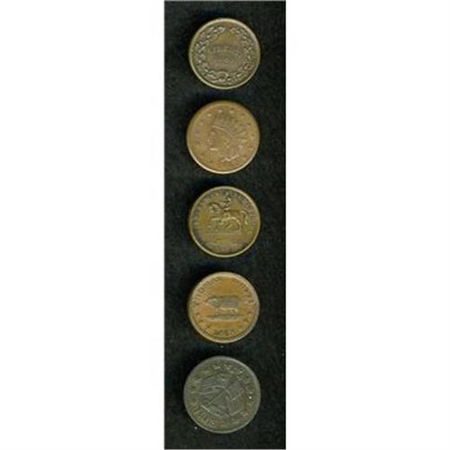 <B>Small Group of Civil War Tokens.</B></I> The lot includes three patriotic tokens and two merchant tokens. Included are: <B>Fuld-63/443a, R.2, AU; Fuld-174/272, R.1, AU Verdigris; Fuld-236/426a, R.1, XF Digs; Fuld-NY630CH-3a, R.7, XF; Fuld-PA750S-1a, R.2, AU.</B></I><BR><BR><b>Shipping:</b> Coins & Currency (<a target="_blank" href="http://www.heritageauctions.com/common/shipping.php">view shipping information</a>)